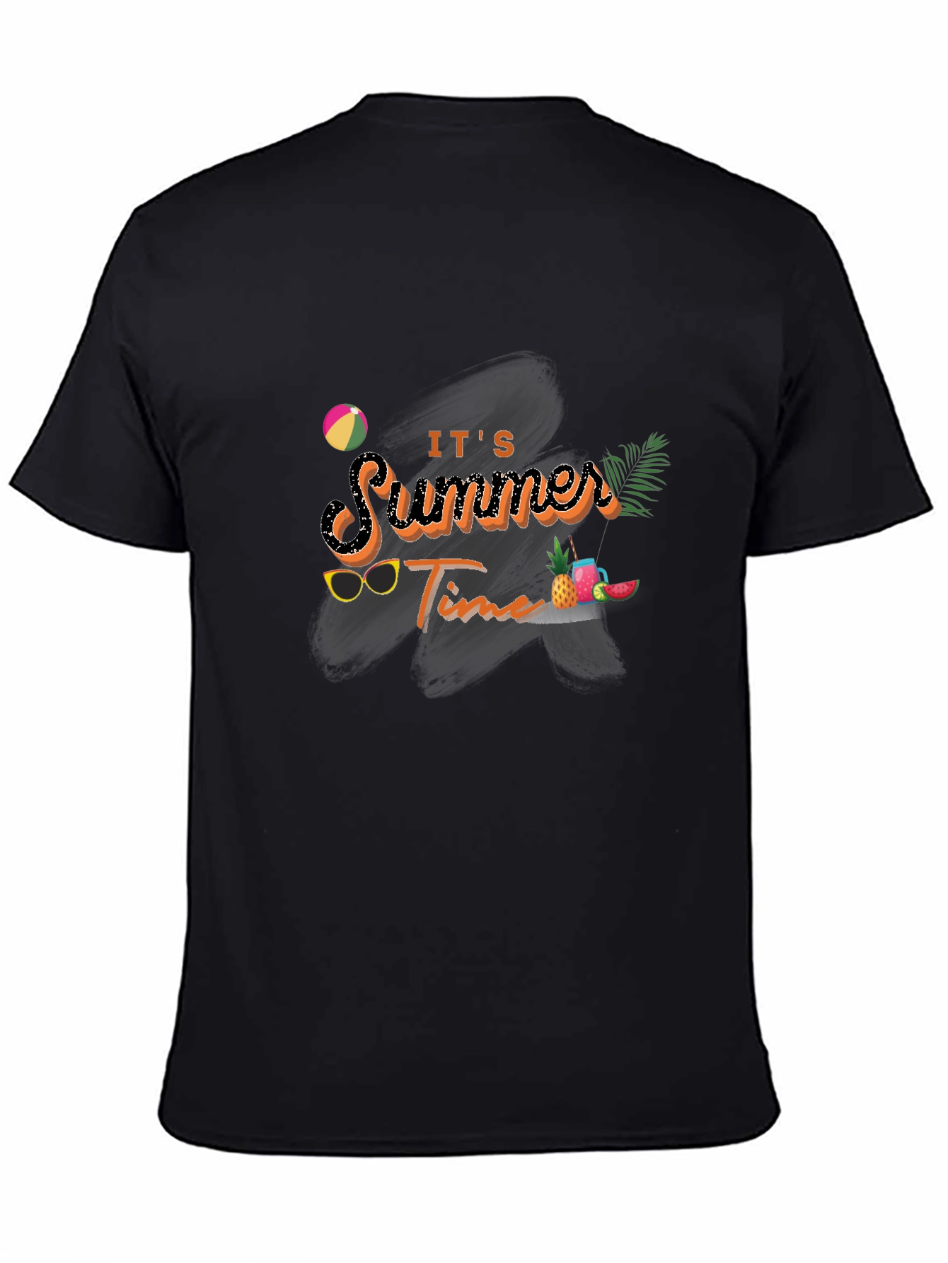 Embrace the summer vibes with this stylish black graphic tee! The shirt features a vibrant and playful design with the words "It's Summer Time" in a fun, eye-catching font. The graphic also includes summery elements such as a beach ball, sunglasses, pineapple, and tropical leaves, adding to the cheerful aesthetic. Made from a soft and comfortable fabric, this tee is perfect for casual outings, beach days, or summer parties. Show off your love for the season in this unique and trendy shirt.