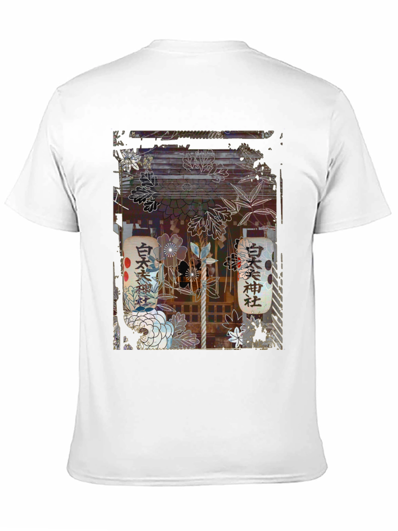 Embrace unique style with this striking black graphic tee. The shirt features an intricate, detailed print of a Japanese shrine scene, complete with floral motifs and traditional lanterns. The design exudes an artistic, slightly distressed aesthetic, adding an edgy touch to a classic garment. Made from what appears to be a comfortable and breathable fabric, this unisex t-shirt is perfect for casual wear. Pair it with jeans or shorts for an effortlessly cool look. Ideal for those who appreciate Japanese culture or unique artistic designs, this t-shirt is a standout piece that will turn heads.