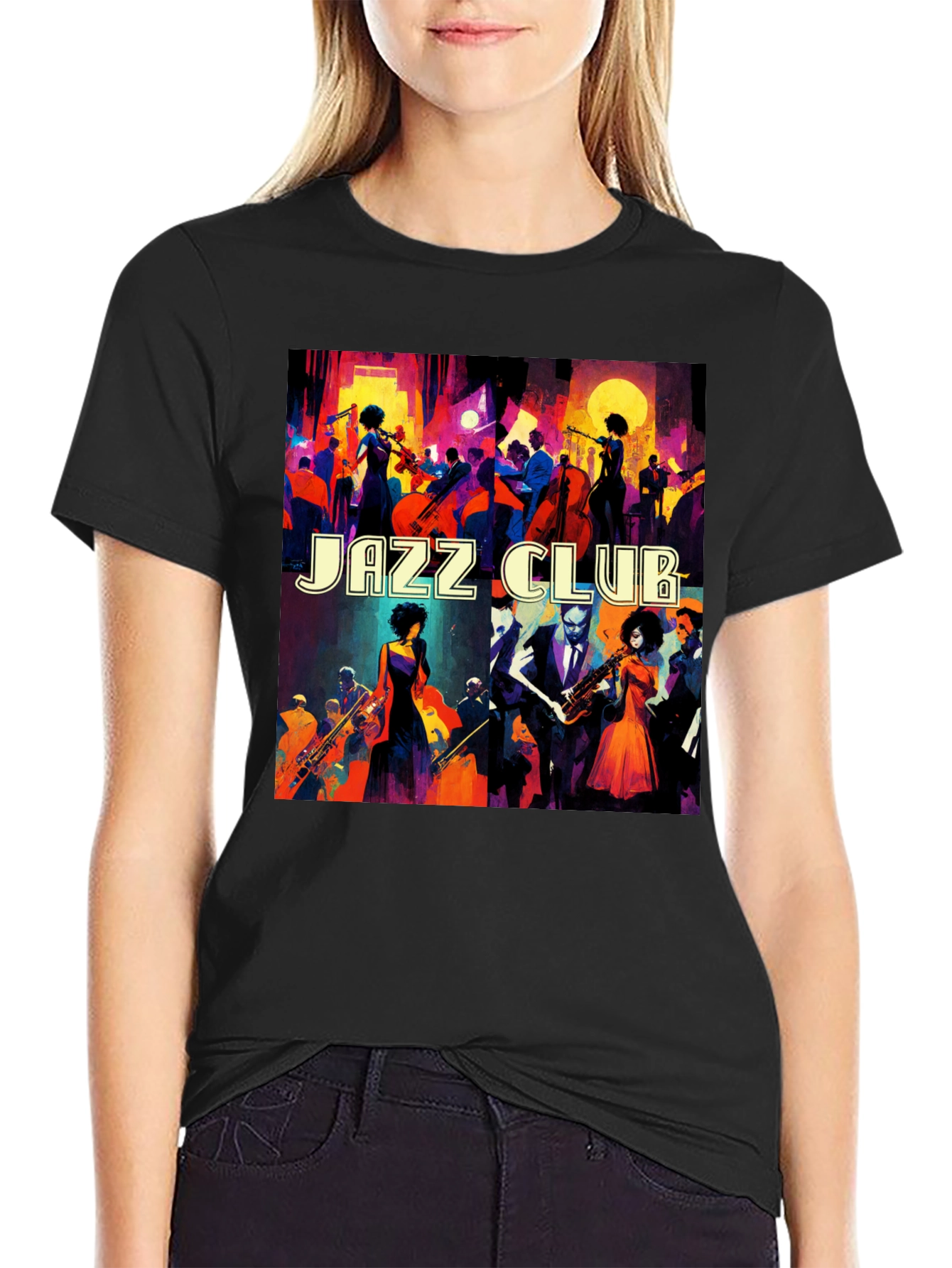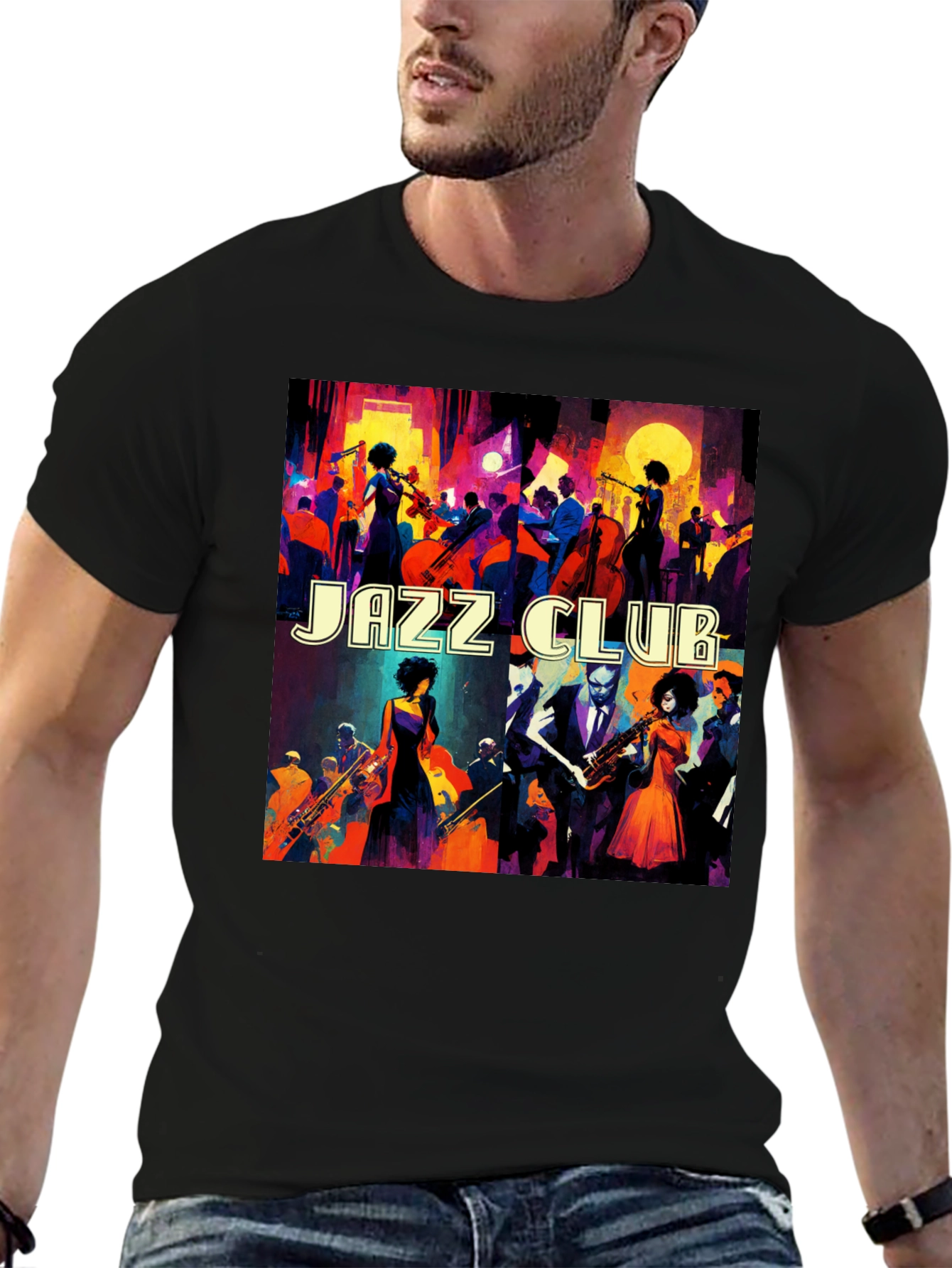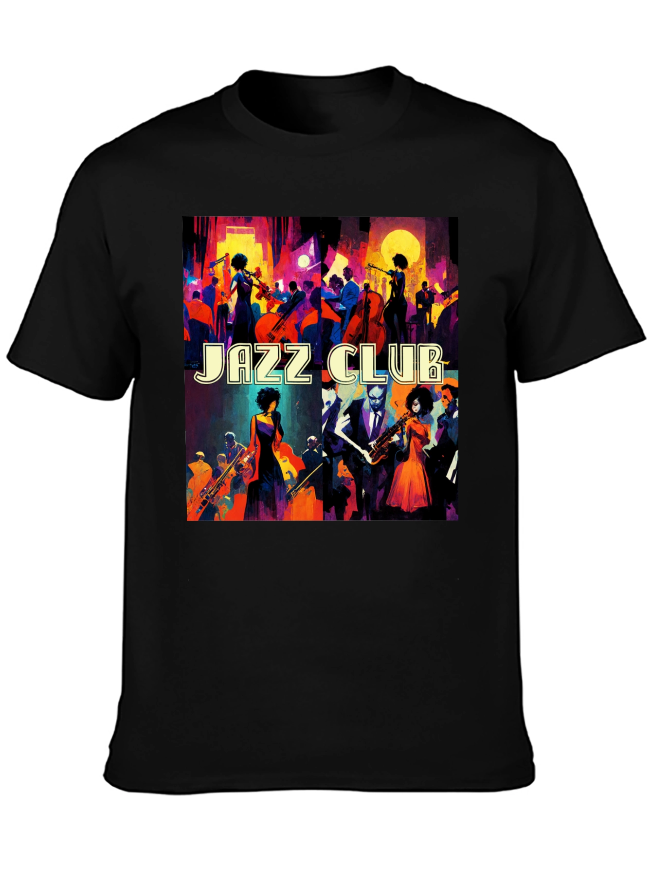 Immerse yourself in the vibrant world of jazz with this stylish black t-shirt. Featuring a bold and colorful illustration depicting a lively jazz club scene, this tee is perfect for music lovers and art enthusiasts alike. The design showcases musicians playing various instruments amidst a bustling crowd, capturing the energy and atmosphere of a live jazz performance. Made from a comfortable and breathable fabric, this t-shirt is ideal for everyday wear, concerts, or casual outings. Show off your passion for jazz with this unique and eye-catching tee.