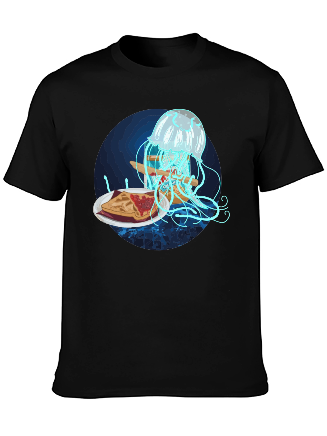 Dive into style with this unique black graphic tee! Featuring a quirky and colorful design, a jellyfish hovers over a plate of peanut butter and jelly sandwich. The tee is made from a soft, comfortable material, perfect for everyday wear. The vibrant graphic is sure to turn heads and spark conversation, making it a standout piece in your wardrobe. Ideal for casual outings, concerts, or just lounging around, this tee combines comfort with a touch of whimsical artistry. Embrace the unexpected and add this statement tee to your collection today!