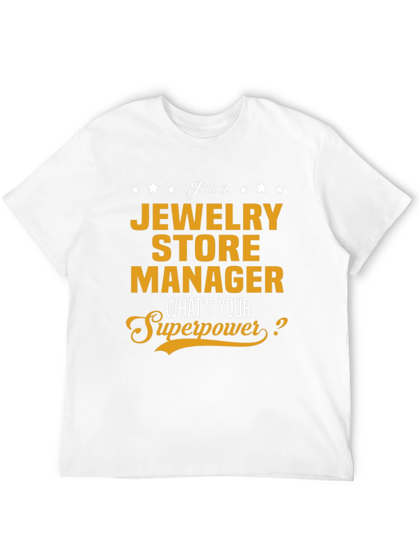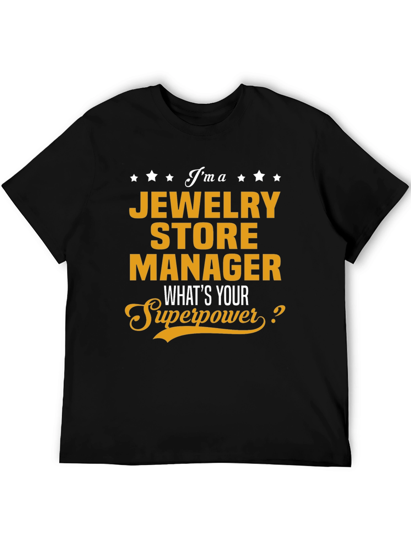 Showcase your unique talents with this eye-catching "Jewelry Store Manager - What's Your Superpower?" t-shirt. This black tee features a bold, gold-colored graphic design with stars adding a touch of flair. The statement is printed in a mix of sans-serif and script fonts, making it both professional and fun. Made from a comfortable material, this shirt is ideal for casual wear, work events, or as a thoughtful gift for the jewelry store manager in your life. Let everyone know about your superpower and make a statement with this unique tee!