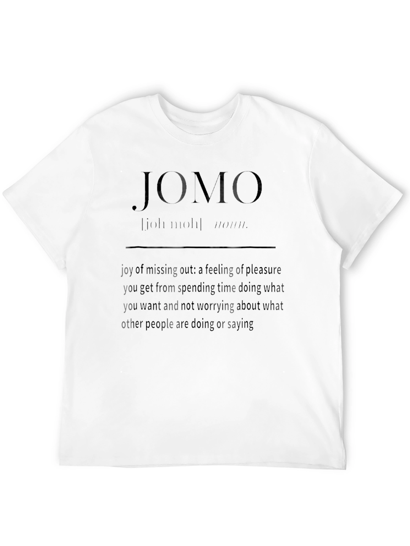 Embrace the joy of missing out with this stylish and comfortable black graphic tee. The shirt features a JOMO (Joy Of Missing Out) definition design. Made from what appears to be a soft and breathable cotton blend, this tee offers all-day comfort and a relaxed fit. The minimalist design makes it versatile for casual wear, while the message adds a touch of humor and self-awareness. Perfect for those who prioritize their own well-being and enjoy spending time on activities they love, without feeling pressured by social trends. Wear it with jeans, shorts, or your favorite casual bottoms. A great way to express your individuality and embrace a mindful approach to life.