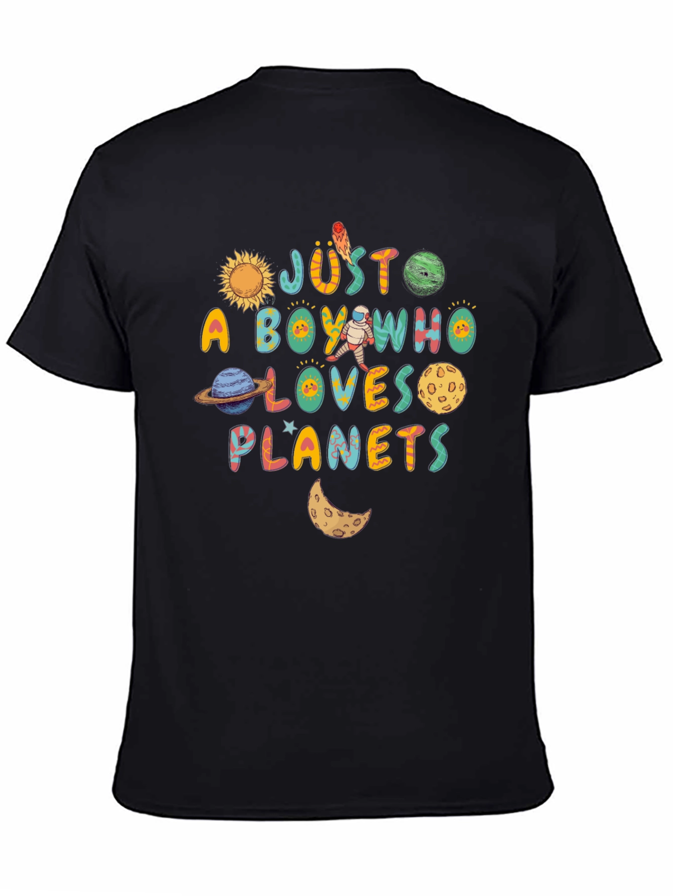 Show off your love for the cosmos with this eye-catching graphic t-shirt! This tee features a vibrant and playful design with the phrase "Just A Boy Who Loves Planets" spelled out using various celestial bodies and space-themed illustrations. The design includes images of the sun, different planets, an astronaut, and a crescent moon. Made from a soft and comfortable fabric, this tee is perfect for everyday wear, casual outings, or astronomy enthusiasts. Express your passion for outer space and turn heads with this unique t-shirt.