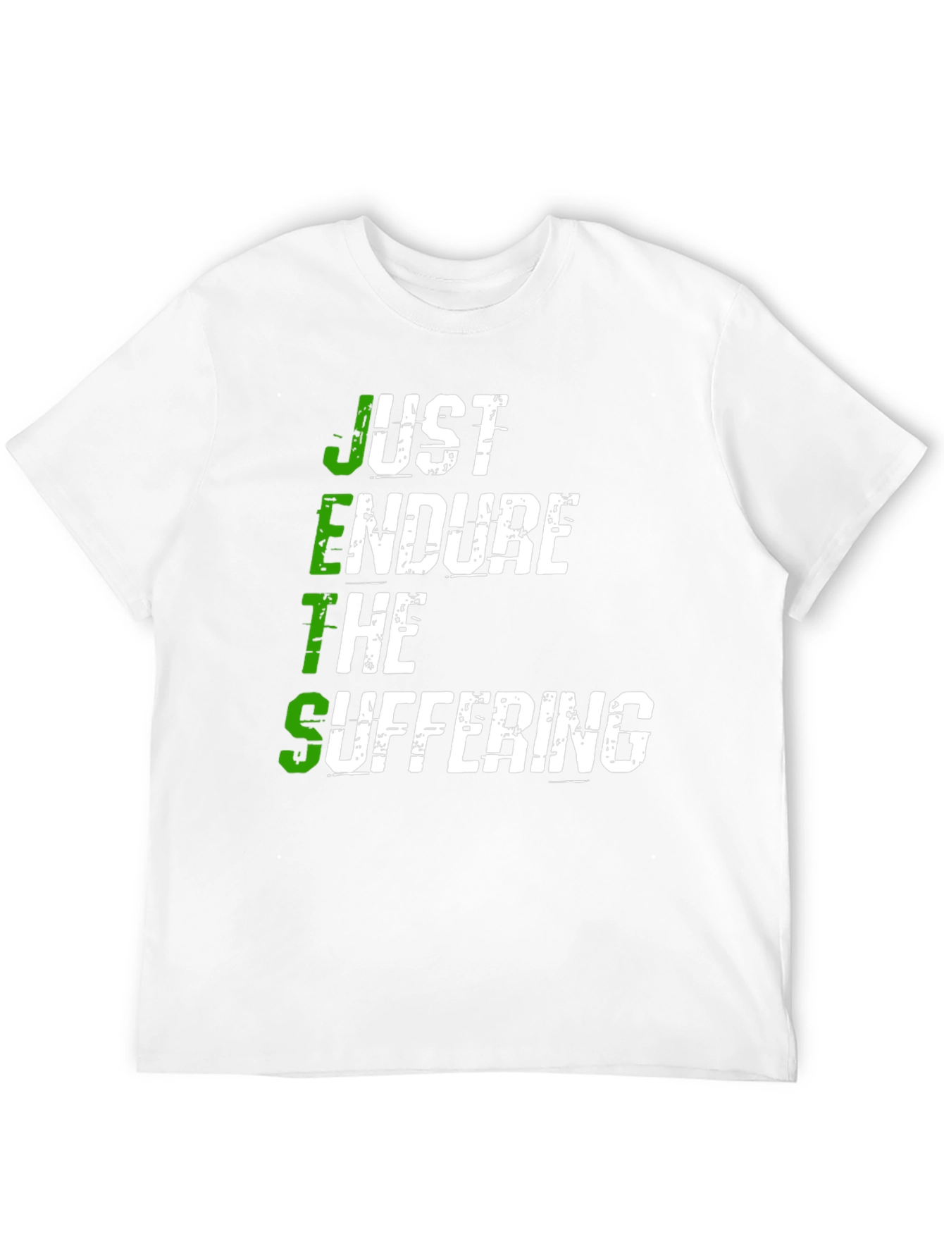 This black t-shirt features a bold and distressed graphic print. The design incorporates the word "JETS" vertically, with the "J", "E", "T", and "S" in striking green, spelling out "Just Endure The Suffering". The remaining letters are in white, enhancing the overall impact. Crafted from a comfortable-looking fabric, this tee is ideal for casual wear. Its eye-catching design makes it a great conversation starter and a must-have for fans with a sense of humor. Perfect for game days, casual outings, or simply expressing your unique style.