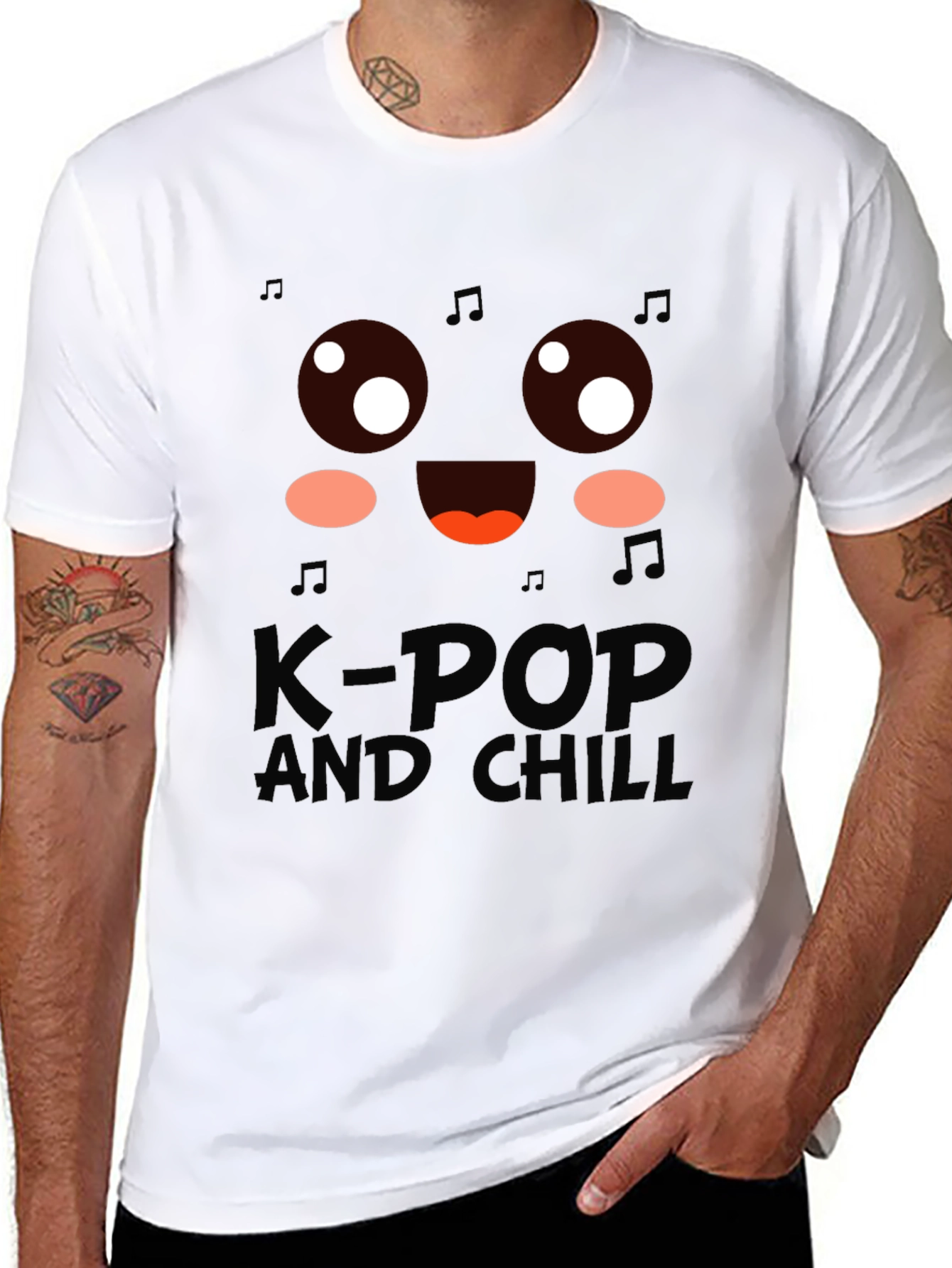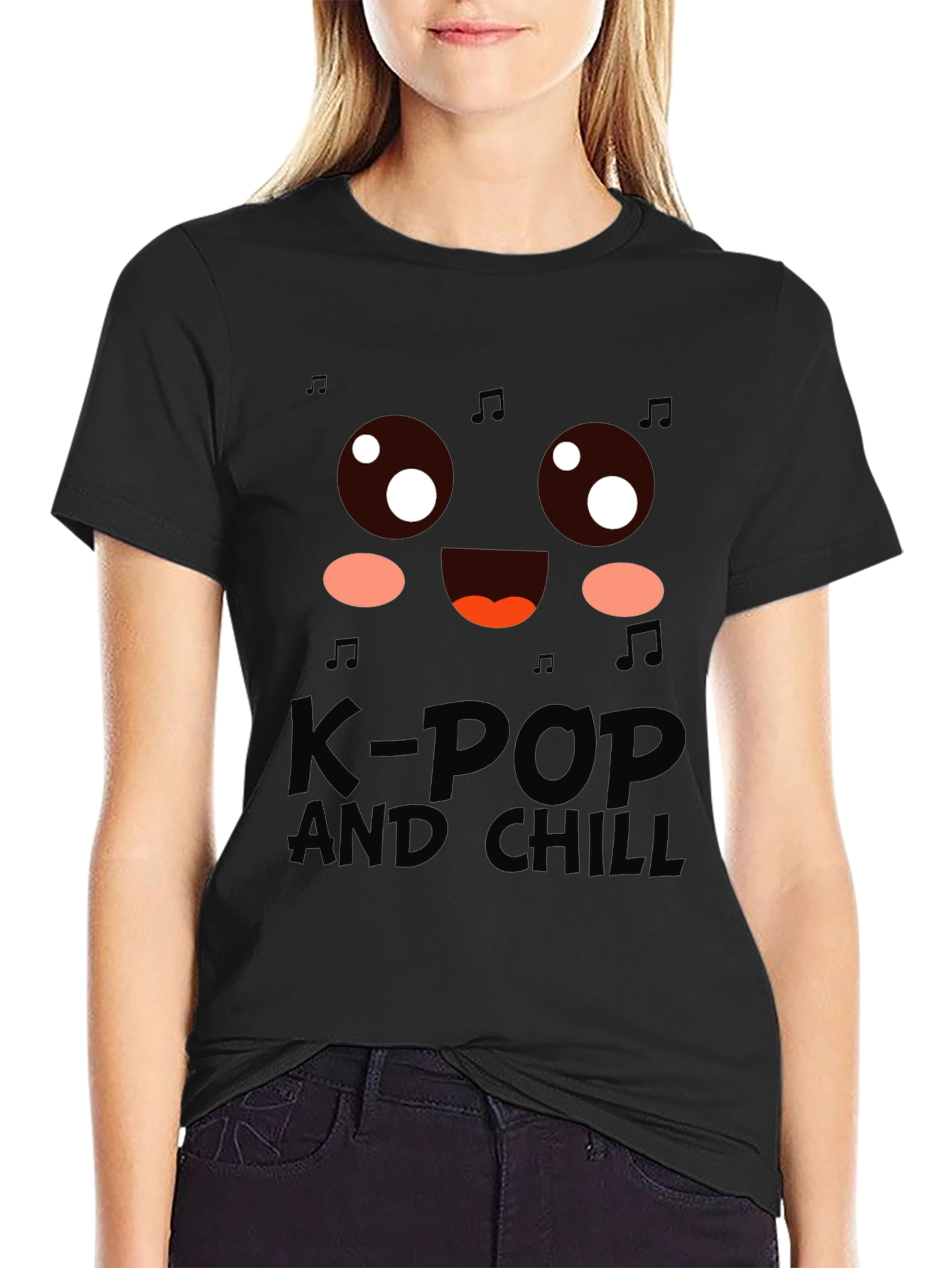 Express your love for K-Pop with this stylish black graphic tee! The shirt features a cute, stylized face design with musical notes accents, perfect for any K-Pop enthusiast. The phrase "K-POP AND CHILL" is prominently displayed below the graphic, making it a fun and playful statement piece. Crafted from a comfortable, breathable fabric, this tee is ideal for casual wear, concerts, or just relaxing at home while listening to your favorite K-Pop tunes. Show off your passion for music and culture with this must-have t-shirt! A great gift for any fan.