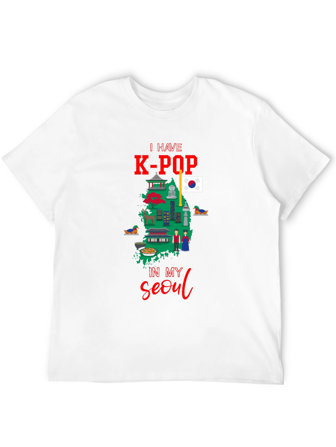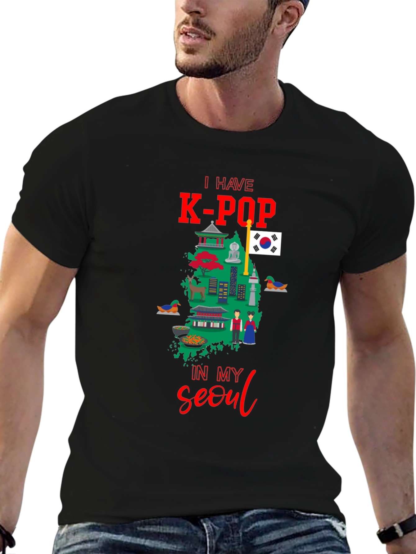 Show your love for Korean culture with this unique black t-shirt! This eye-catching tee features a colorful illustration of the Korean peninsula, complete with iconic landmarks and the South Korean flag. Bold red lettering proclaims "I HAVE K-POP in my seoul," making it a perfect souvenir or a stylish statement piece. The shirt appears to be made of comfortable fabric, ideal for everyday wear. Whether you're attending a K-pop concert or simply want to express your fandom, this t-shirt is a must-have addition to your wardrobe. Get yours today and rep the vibrant culture of South Korea!