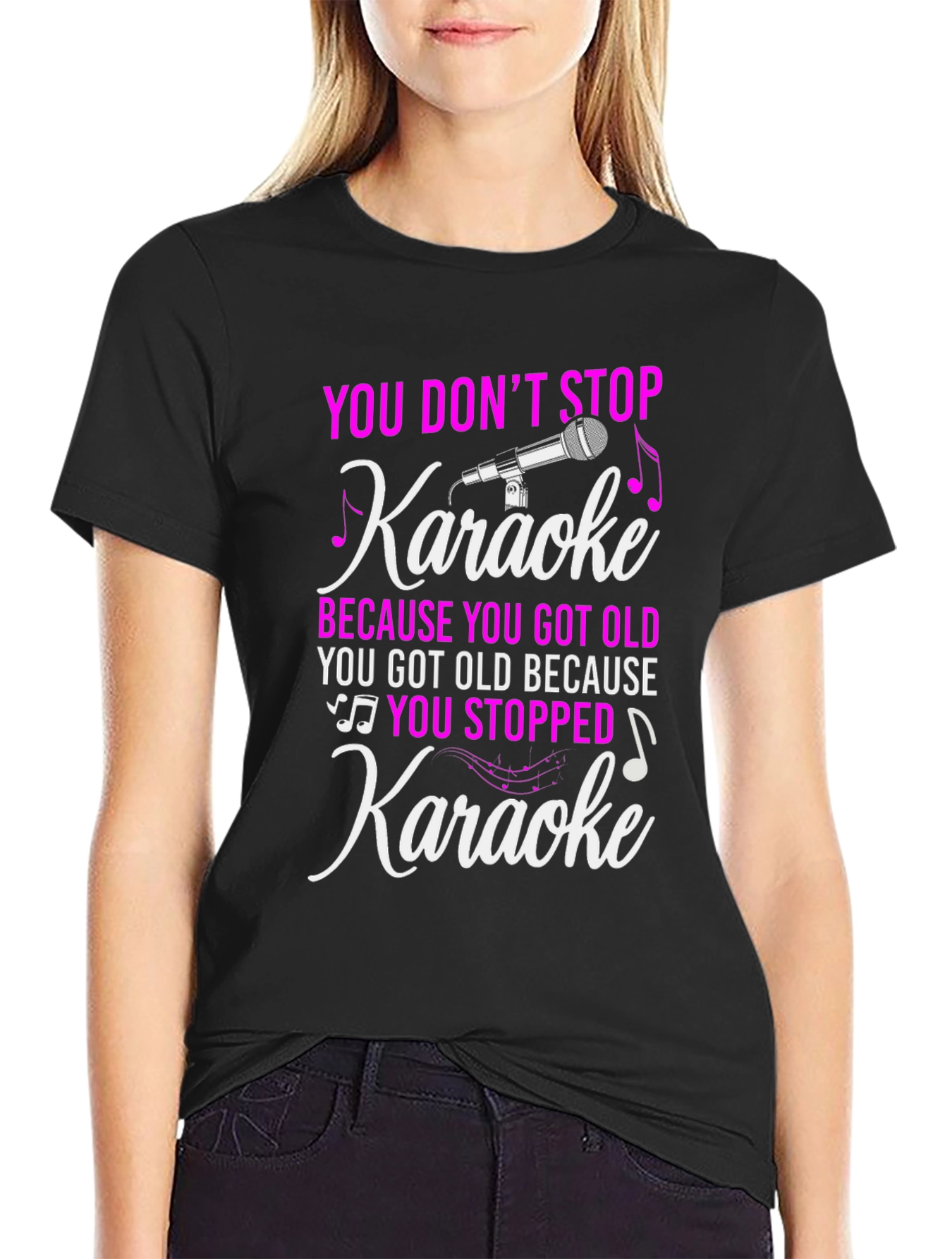 Show off your love for singing with this stylish Karaoke T-shirt! This tee features a bold graphic design with the phrase 'YOU DON'T STOP Karaoke BECAUSE YOU GOT OLD YOU GOT OLD BECAUSE YOU STOPPED Karaoke' accented with a microphone and musical notes. The text is featured in a bright pink and white color. Perfect for karaoke nights, music events, or casual wear. Made from comfortable, breathable fabric, this shirt is sure to be a hit with any music enthusiast. This shirt makes a great gift for karaoke lovers. Available in a variety of sizes.