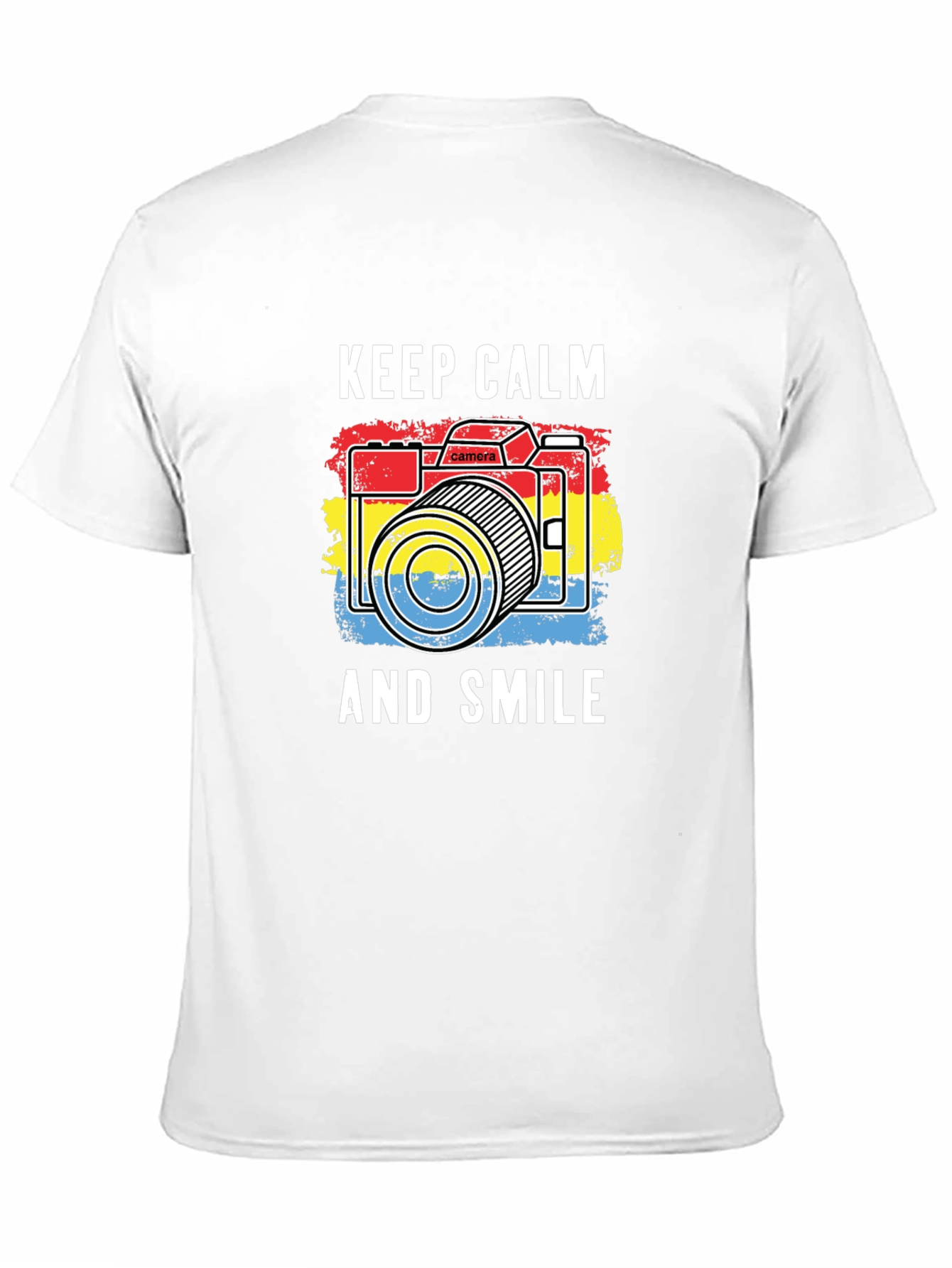 Capture the perfect moment with this trendy graphic tee! This shirt features a classic camera design with red, yellow, and blue stripes, paired with the witty saying "Keep Calm and Smile". Perfect for photographers or anyone who loves a fun, vintage look. Made from a soft material, this tee ensures comfort while showcasing your passion for photography. Ideal for casual outings, photo shoots, or as a thoughtful gift for the camera enthusiast in your life. Add a pop of color and positive vibes to your wardrobe with this must-have t-shirt.