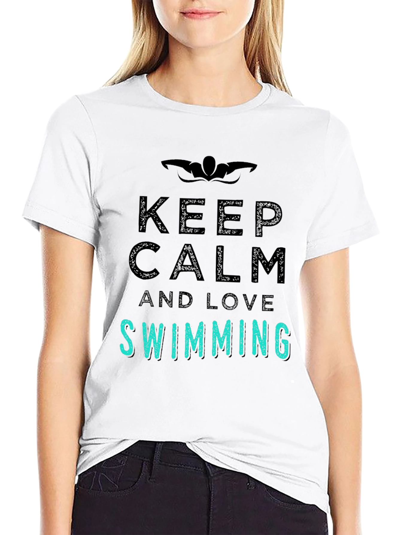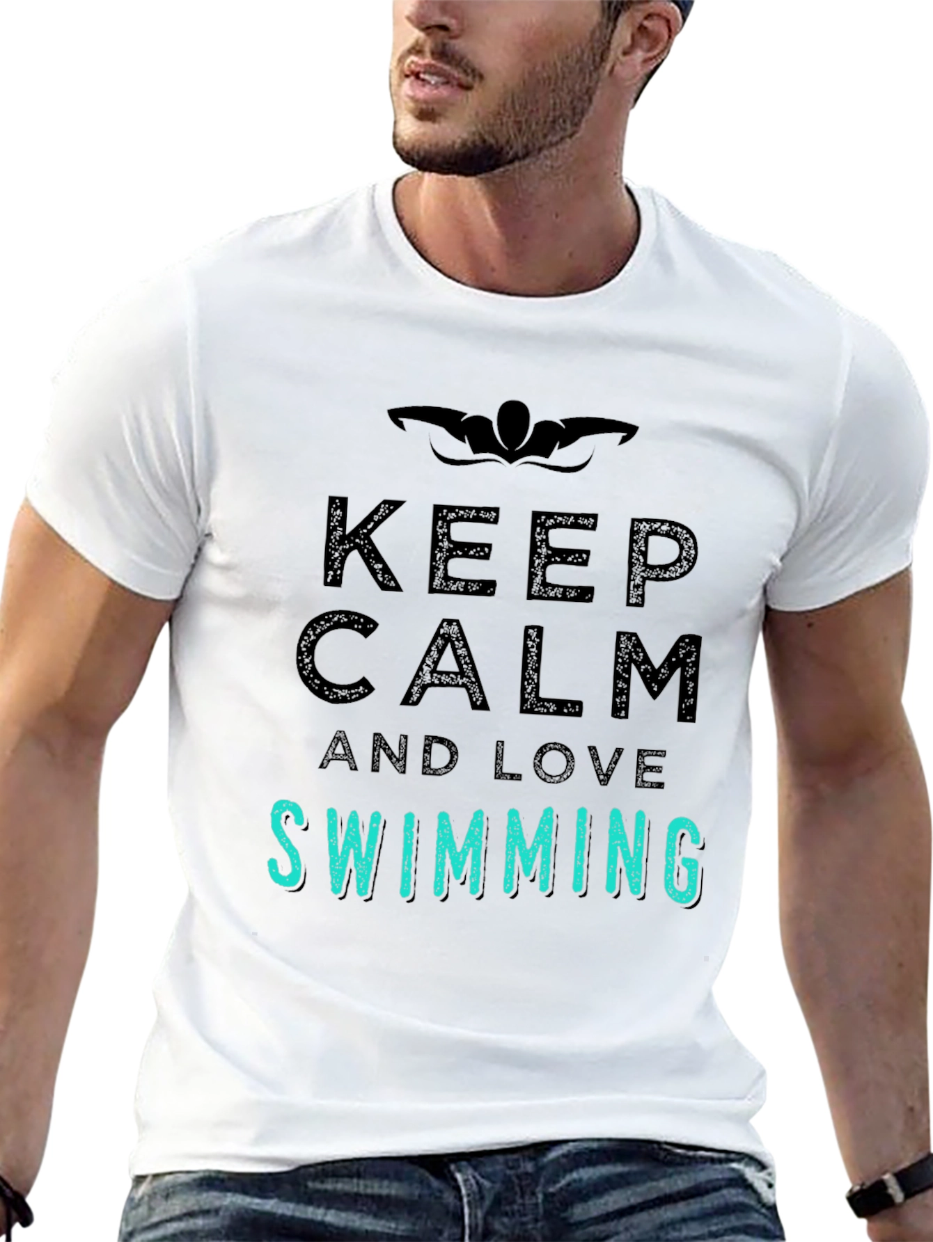 Show your love for swimming with this stylish black t-shirt. Featuring a bold "KEEP CALM AND LOVE SWIMMING" design in contrasting black and teal lettering, this shirt is perfect for swimmers and water sports enthusiasts alike. The shirt showcases a streamlined swimmer graphic, adding a touch of sporty flair. Made from what appears to be a soft, comfortable fabric, this tee ensures a great fit and all-day comfort. Ideal for casual wear, swim meets, or as a gift for the swimmer in your life.