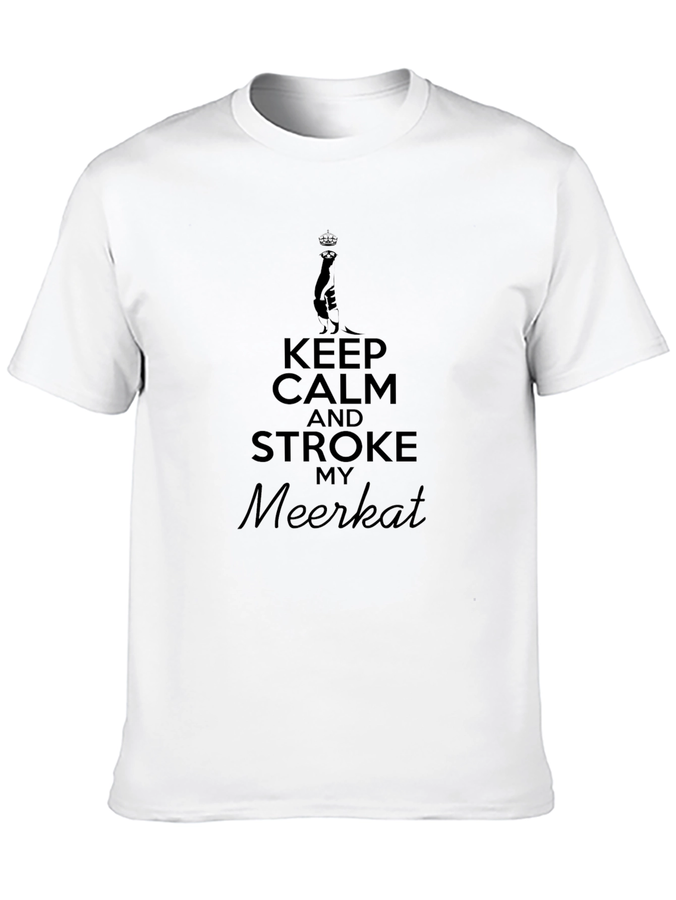 Stay cool and show your love for meerkats with this eye-catching black t-shirt. The shirt features a humorous "Keep Calm and Stroke My Meerkat" design, complete with a meerkat graphic, printed in black on a comfortable, breathable fabric. Perfect for casual wear, this tee is a great conversation starter and a fun way to express your unique personality. Whether you're a meerkat enthusiast or just appreciate a good joke, this t-shirt is sure to become a favorite in your wardrobe. Great for everyday wear, or as a unique gift for the animal lover in your life.