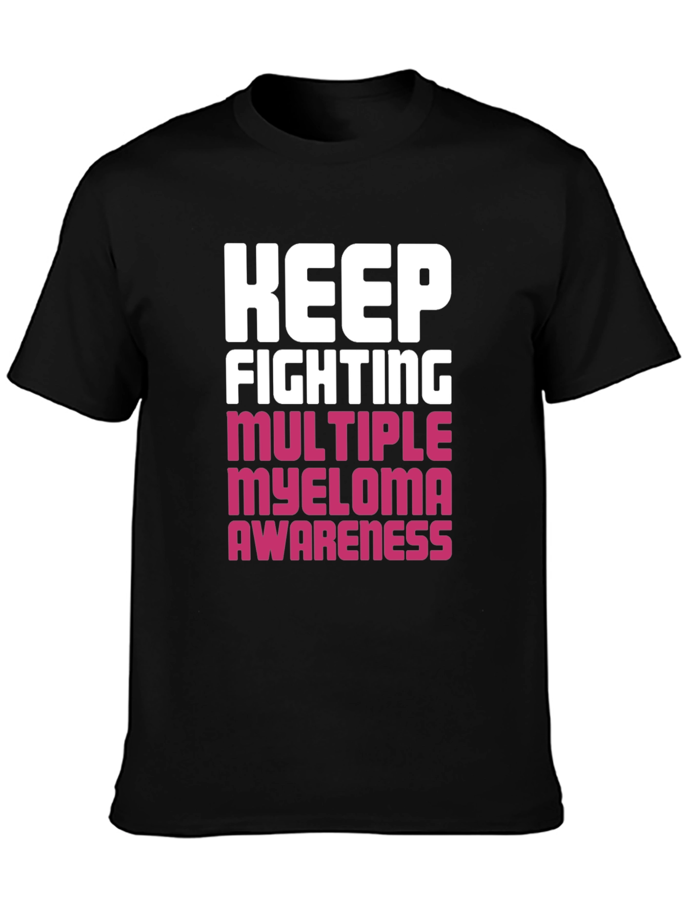 Show your support with this bold black t-shirt. Featuring a powerful message, the shirt reads "KEEP FIGHTING MULTIPLE MYELOMA AWARENESS" in eye-catching white and pink lettering. Made from a comfortable, breathable fabric, this tee is perfect for raising awareness and starting conversations. Wear it to support groups, awareness walks, or everyday outings to show your solidarity and spread the word. A meaningful and stylish way to make a difference.
