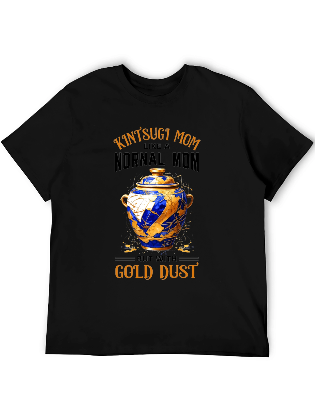 Show off your unique style with this eye-catching Kintsugi Mom T-shirt! Featuring a striking design of a kintsugi-repaired vase filled with vibrant blue and gold accents, this shirt is perfect for anyone who appreciates the beauty of imperfection. The phrase 'Kintsugi Mom, Like A Normal Mom, But With Gold Dust' is printed above and below the design. This eye-catching graphic adds a touch of elegance and resilience to your wardrobe. Made from comfortable, high-quality materials, this T-shirt is great for casual wear or as a conversation starter. Perfect for everyday wear, or as a thoughtful gift for a special mom in your life. Make a statement with this T-shirt!