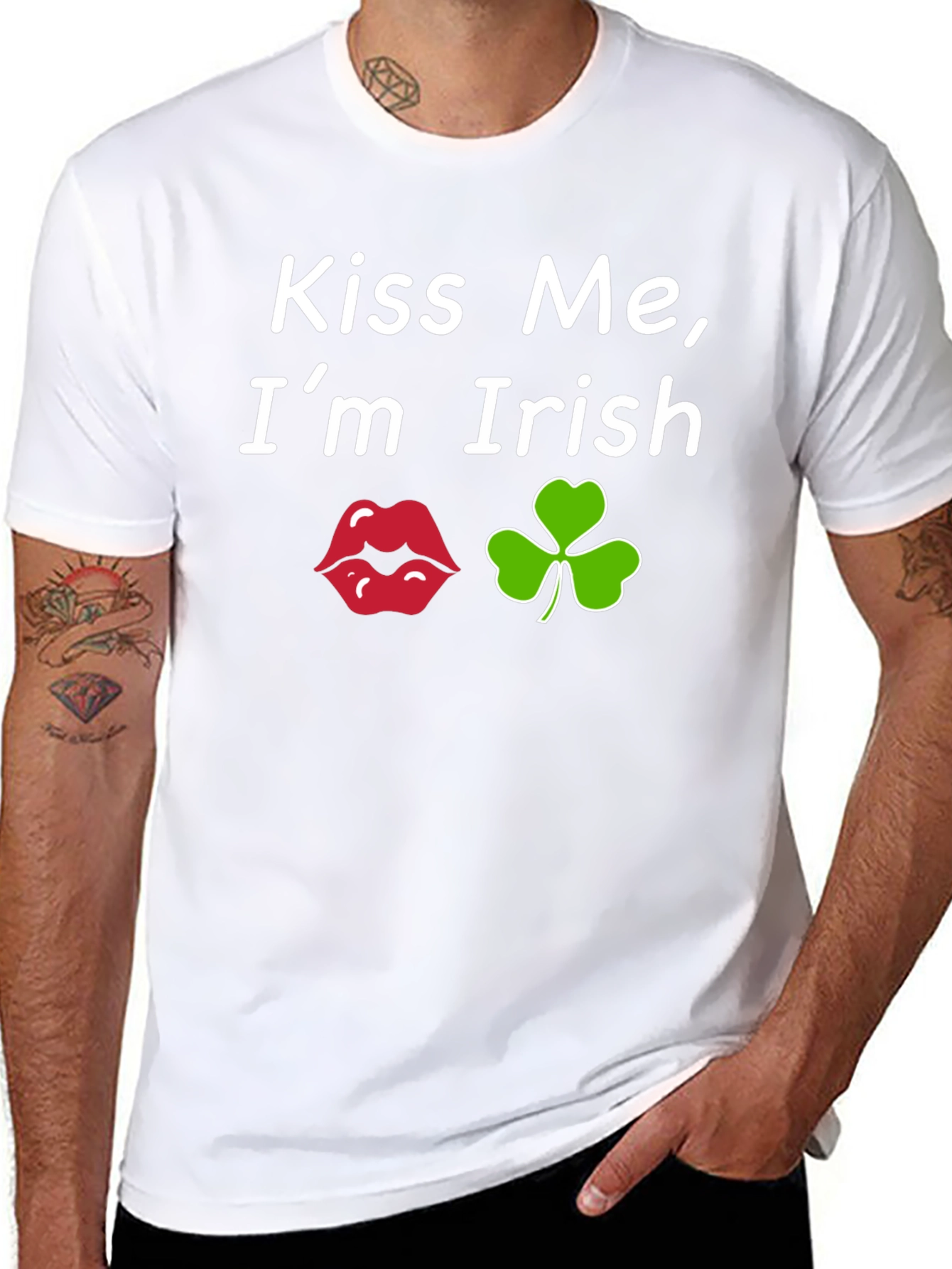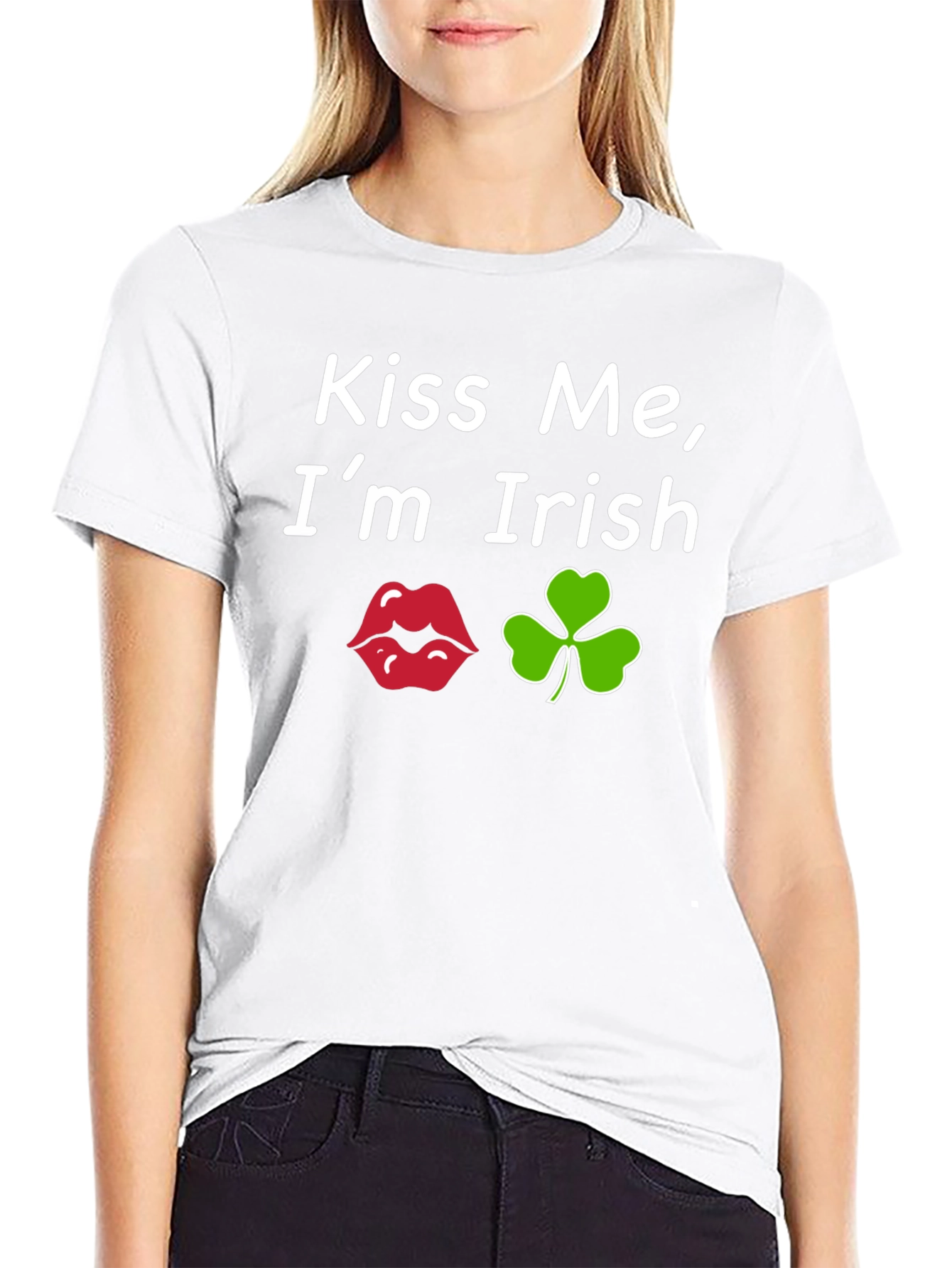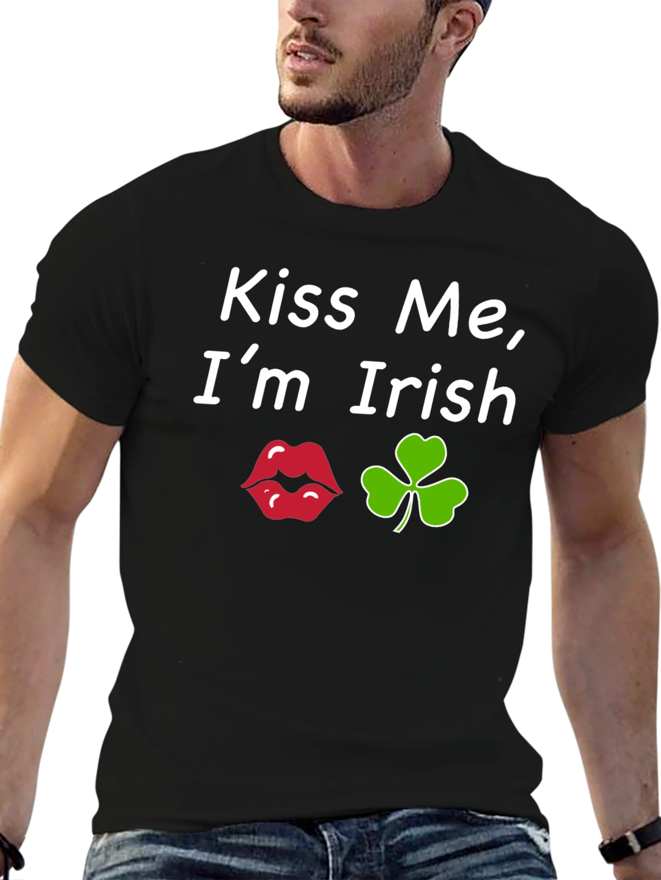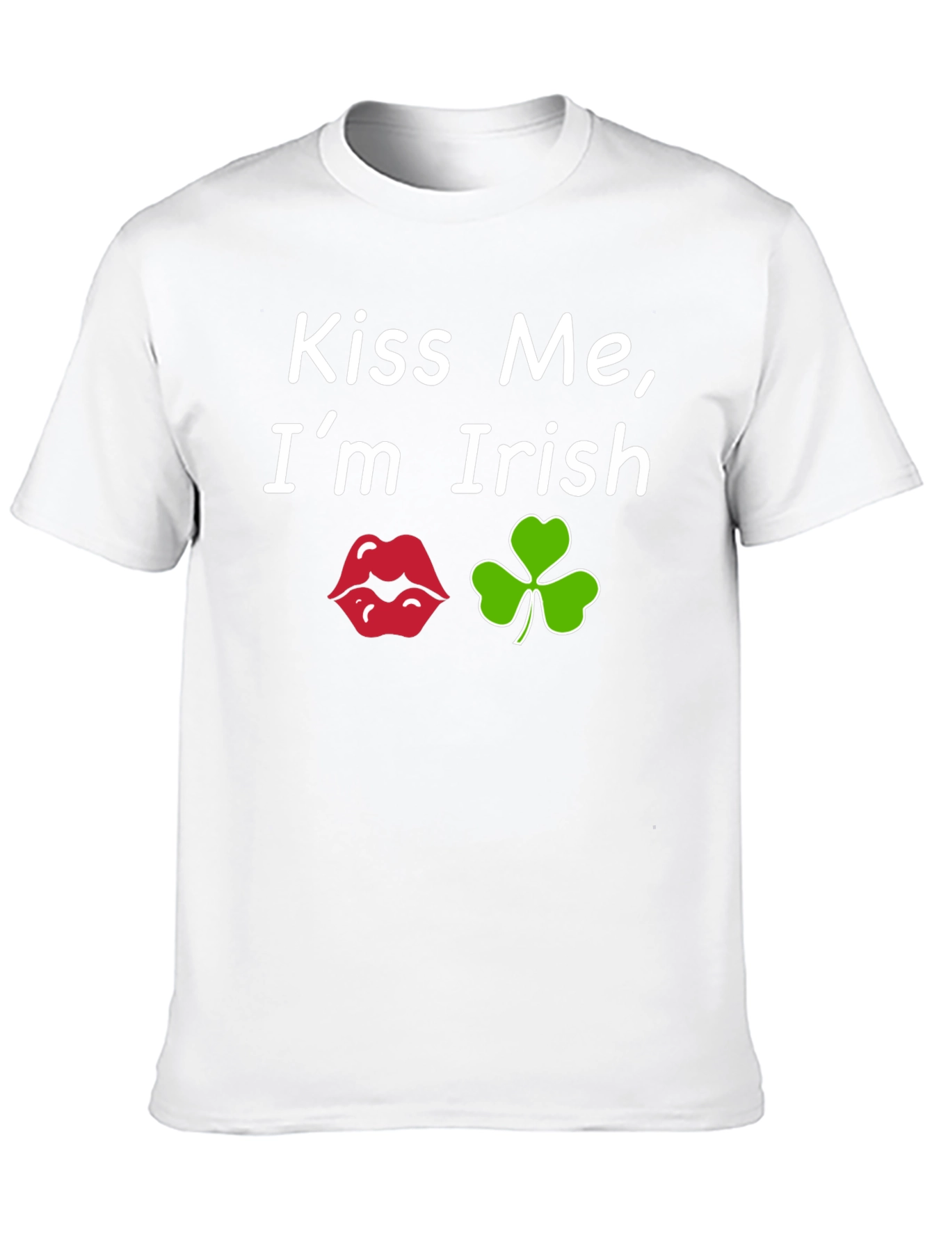 Show your Irish pride with this fun black tee! The shirt features the playful phrase "Kiss Me, I'm Irish" in a clean, white font. The design includes a set of red lips and a vibrant green clover, perfect for St. Patrick's Day celebrations. Made from comfortable fabric, this short-sleeved t-shirt offers a casual and stylish look. Great for parties, parades, or just expressing your Irish heritage, this tee is sure to bring smiles and luck. Get ready to spread some St. Patrick's Day cheer!