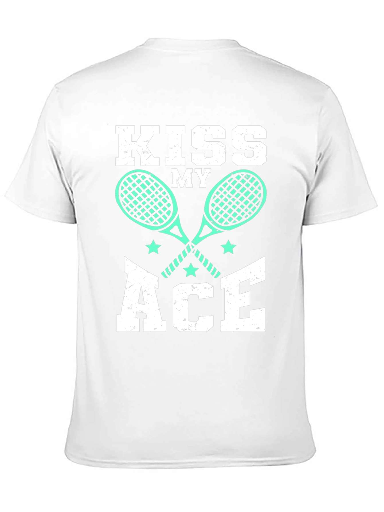 Serve up some style with this bold 'Kiss My Ace' graphic tee. Made from a comfortable, breathable fabric, this black t-shirt features a striking design with crossed tennis rackets and a playful message. The distressed white print gives it a cool, vintage vibe. Ideal for tennis enthusiasts, this tee is perfect for casual wear, workouts, or showing off your love for the game. Make a statement on and off the court with this fun and sporty shirt. A surefire conversation starter, this tee will add some personality to your wardrobe.