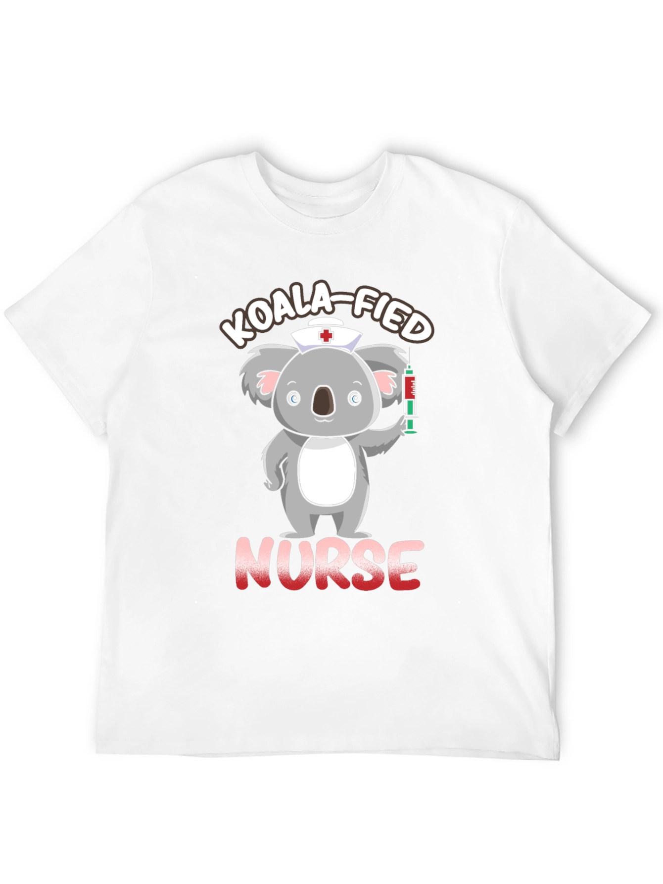 This black t-shirt features a playful and heartwarming design. A cute cartoon koala wearing a nurse's hat and holding a syringe is prominently displayed. Above the koala, the phrase "KOALA-FIED" is written in a curved, playful font, while below it, the word "NURSE" is boldly printed in a gradient red-to-white color. Made from a soft-looking fabric, this tee seems comfortable for everyday wear. It’s a great gift for nurses, especially those with a love for animals or a lighthearted sense of humor. Perfect for casual wear, work events, or showing appreciation for healthcare professionals.