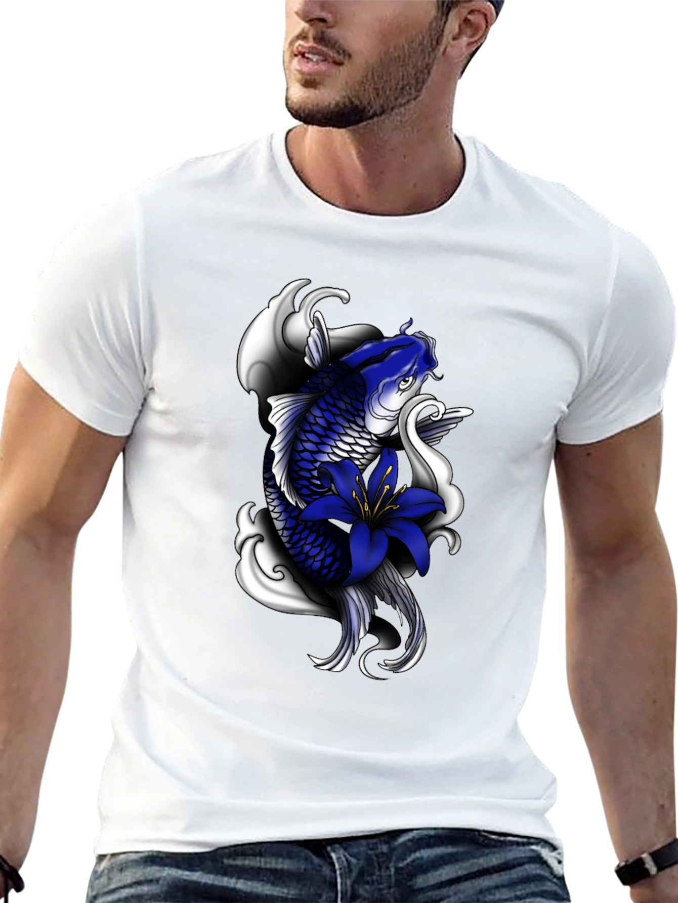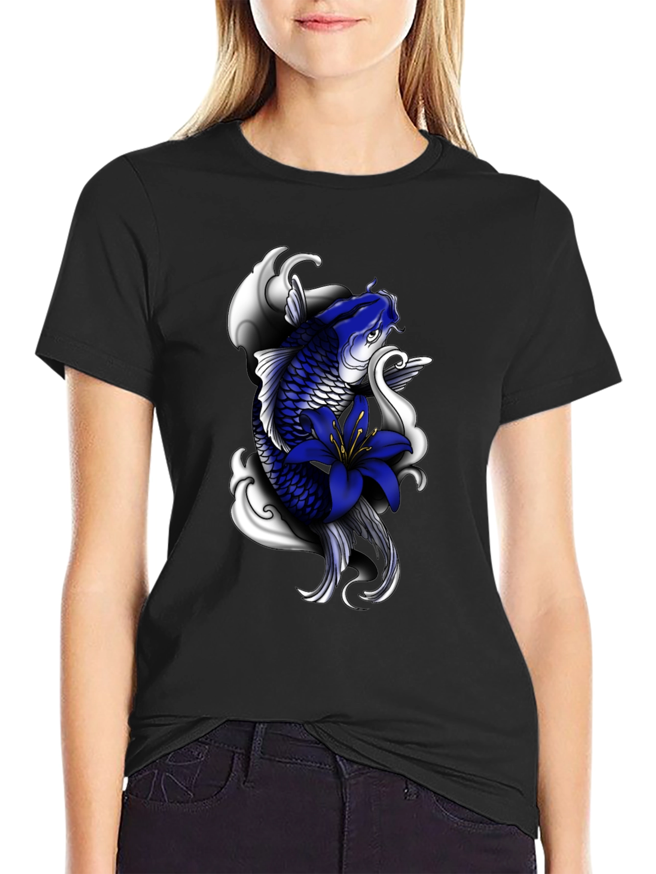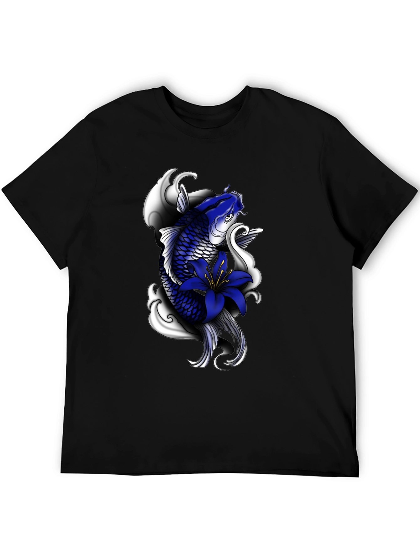 This stylish black t-shirt features a striking graphic print of a blue Koi fish intertwined with a vibrant blue lily. The design is accented with flowing white wave-like patterns, adding a touch of elegance. Made from a comfortable-looking fabric, this tee is perfect for casual wear. The design makes it a unique statement piece for anyone who appreciates aquatic-inspired art. Wear it for everyday occasions or use it to express your individuality. It's a great way to add a pop of color and artistic flair to your wardrobe, setting you apart from the crowd with its unique and eye-catching aesthetic.