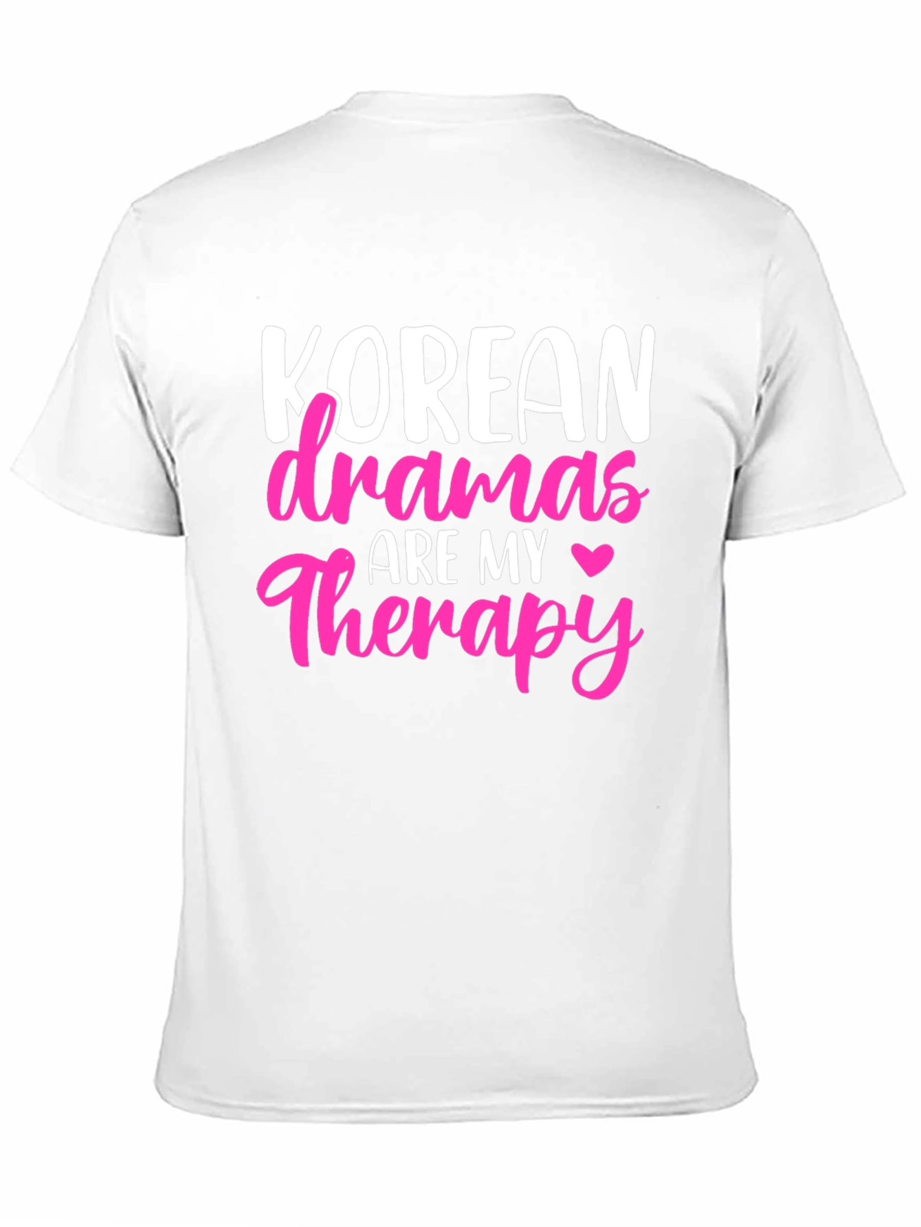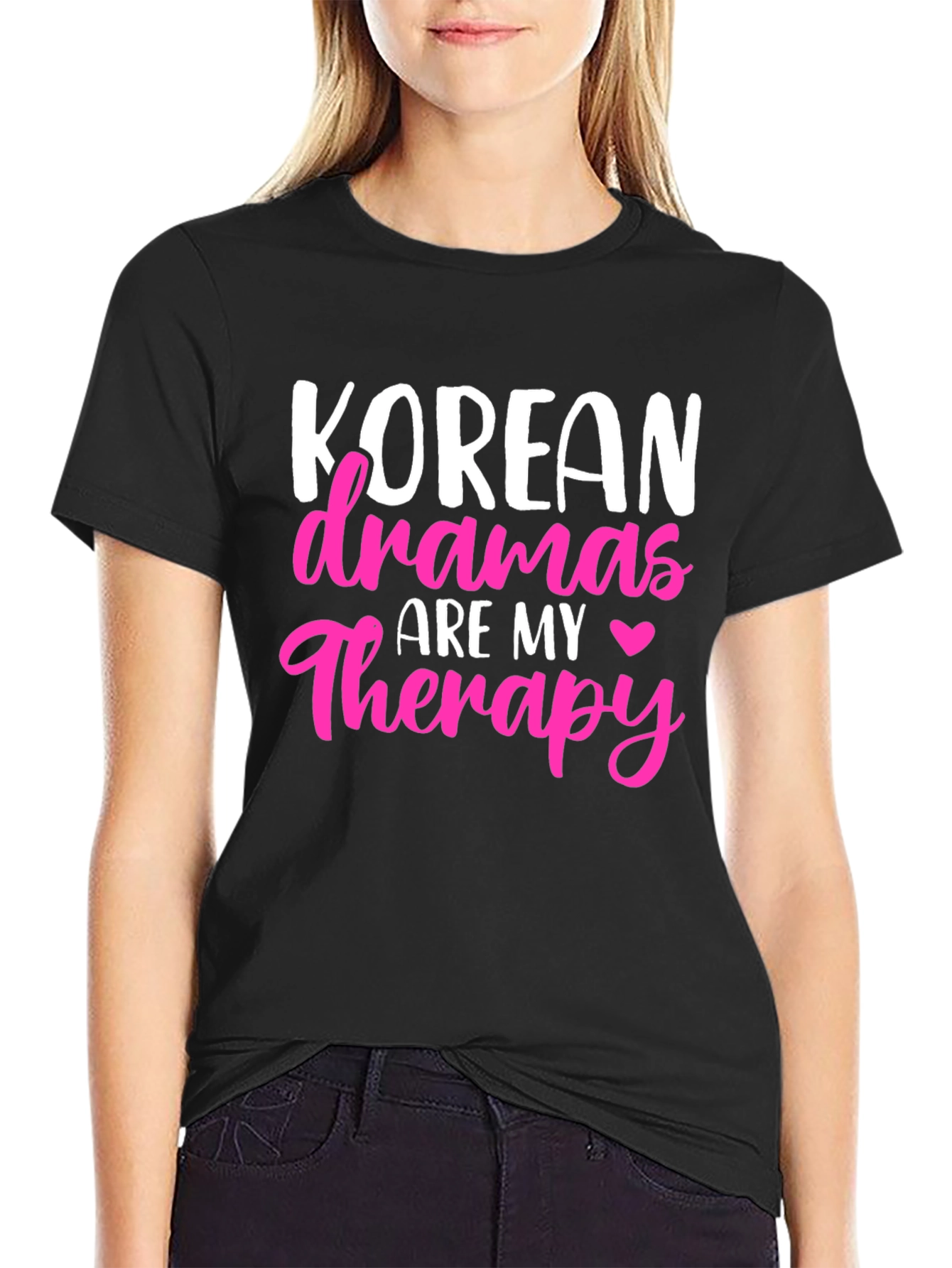 Express your love for K-dramas with this stylish black t-shirt. Featuring a playful design with "KOREAN dramas ARE MY therapy" in white and pink fonts, it's a fun way to showcase your passion. Made from comfortable fabric, this tee is perfect for casual wear, binge-watching sessions, or K-drama fan gatherings. Its classic fit ensures a relaxed feel, while the unique graphic adds a touch of personality to your wardrobe. Embrace your favorite shows in style!