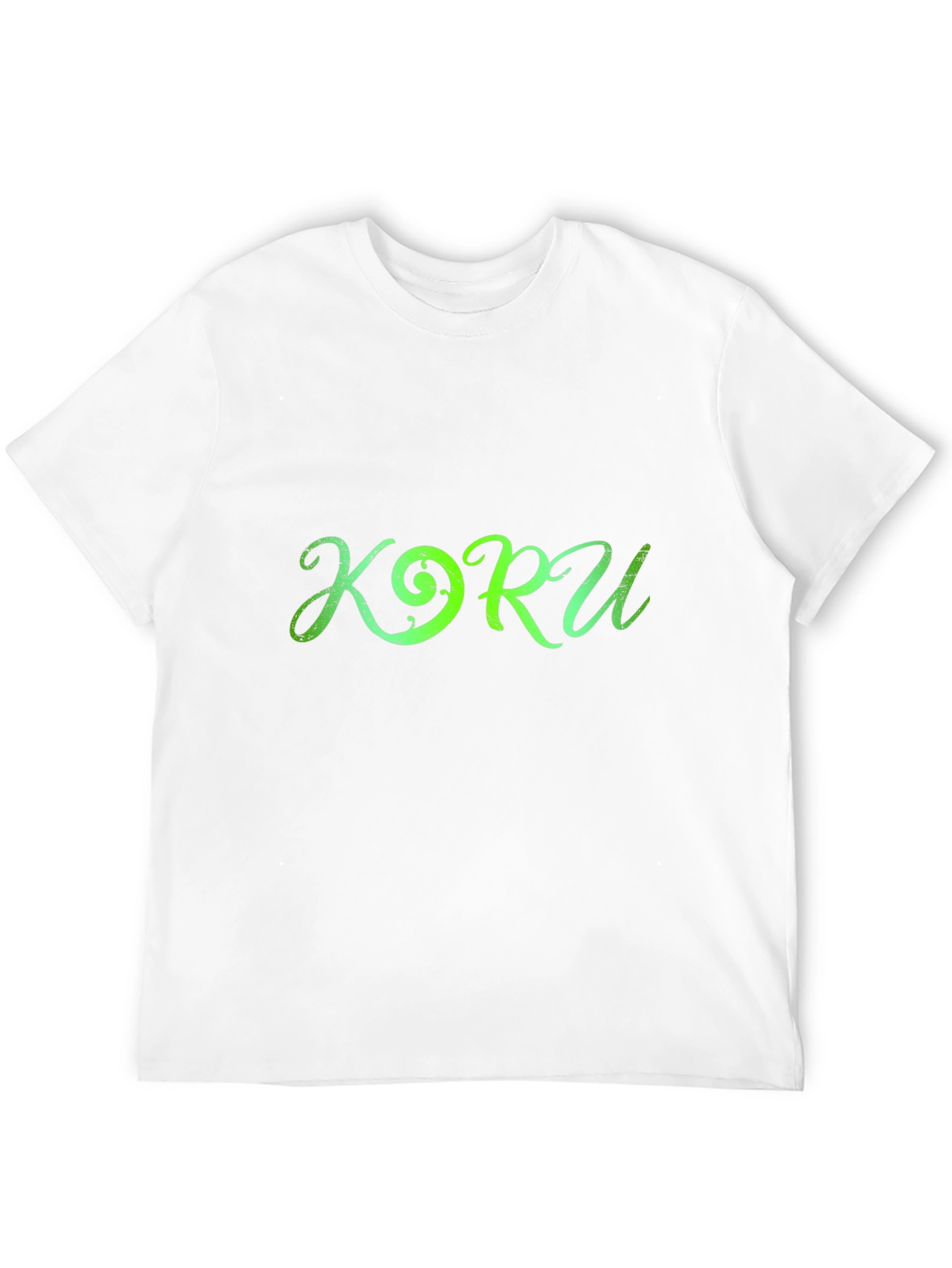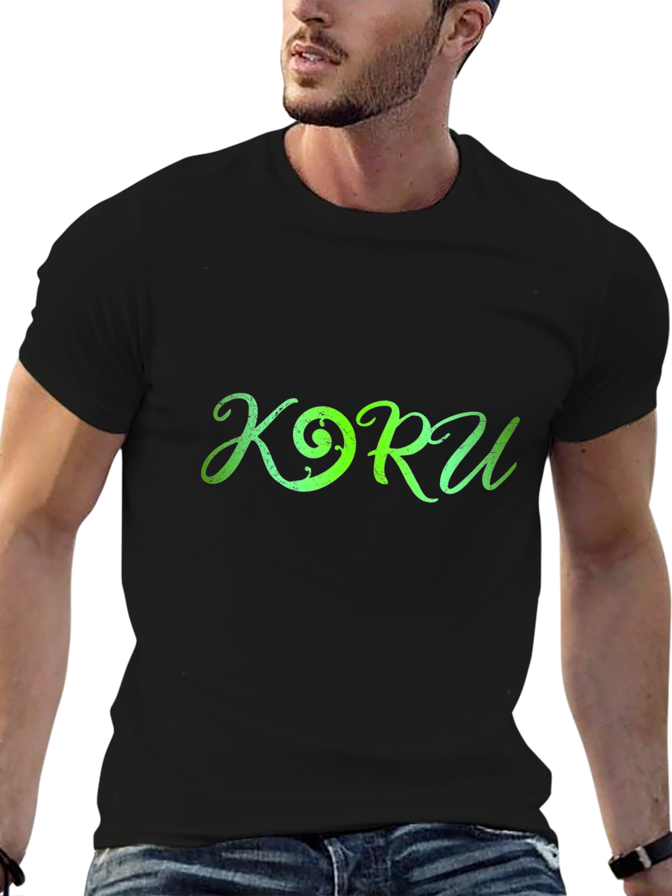 Show off your unique style with this eye-catching black t-shirt. Featuring the word "Koru" in a vibrant green gradient design, this tee is sure to turn heads. The script font and distressed texture add a touch of vintage charm. Made from a soft, comfortable fabric, this shirt is perfect for everyday wear. Pair it with jeans for a casual look, or dress it up with a blazer for a night out. Whether you're hitting the town or just relaxing at home, this t-shirt will keep you looking and feeling great.