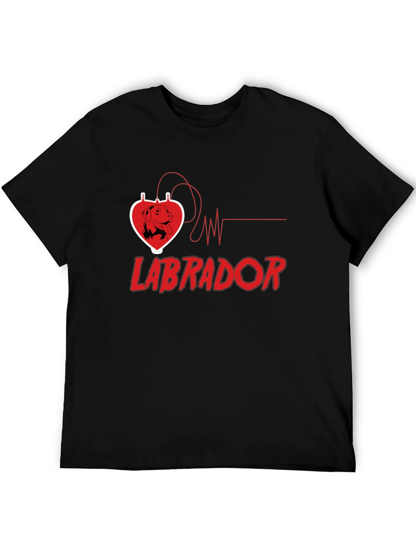 Show your love for Labradors with this stylish black t-shirt. The design features a unique heart-shaped graphic with a Labrador silhouette inside, connected to a heartbeat line. The word 'LABRADOR' is printed below in bold, red lettering. Made from comfortable, breathable fabric, this tee is perfect for casual wear, dog walks, or showing off your passion for your furry friend. It’s a great gift for Labrador owners and dog lovers alike. Stand out with this eye-catching and comfortable t-shirt.