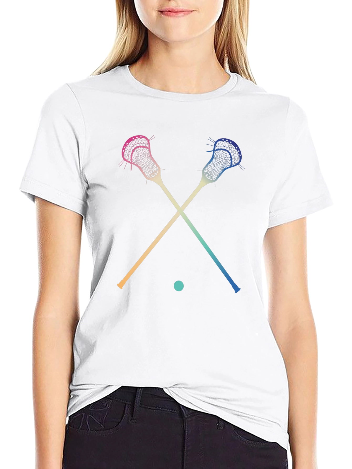 Show off your love for lacrosse with this stylish graphic tee! This black t-shirt features a cool design of two crossed lacrosse sticks with a ball in the center. The sticks boast a gradient color scheme from pink/yellow to blue, adding a vibrant pop of color. Made from a comfortable fabric, this tee is perfect for casual wear, sports events, or showing team spirit. Pair it with your favorite jeans or shorts for a relaxed, sporty look. A must-have for any lacrosse enthusiast's wardrobe!