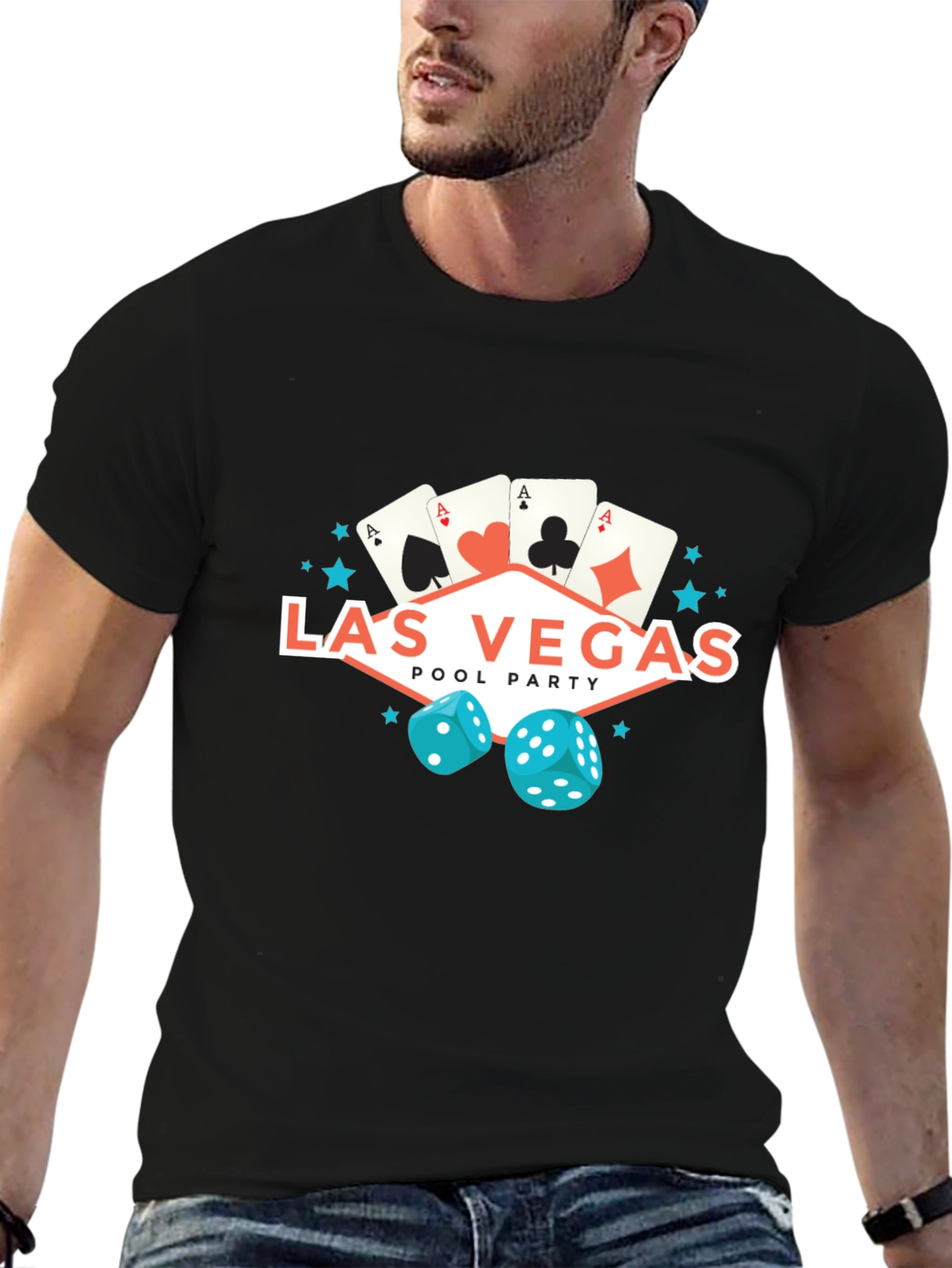 Get ready for fun in the sun with this vibrant Las Vegas Pool Party graphic tee. This black t-shirt features a bold design with playing cards, dice, and star accents. Ideal for casual wear, pool parties, or a trip to Vegas, this eye-catching tee is sure to turn heads. Made from comfortable fabric for a great fit, it combines style and comfort. Perfect for those who love casino vibes and laid-back style. Grab yours now and make a statement!