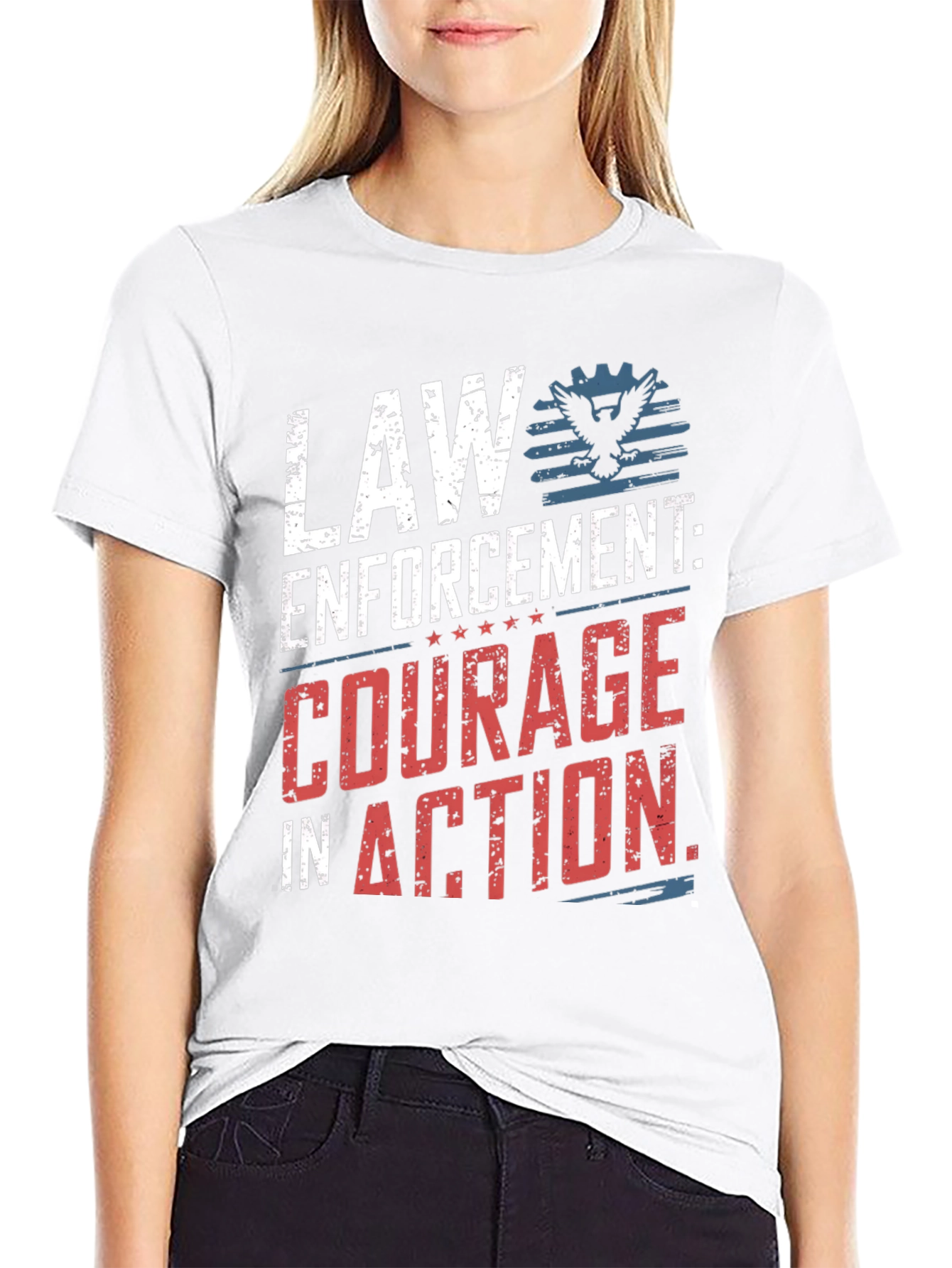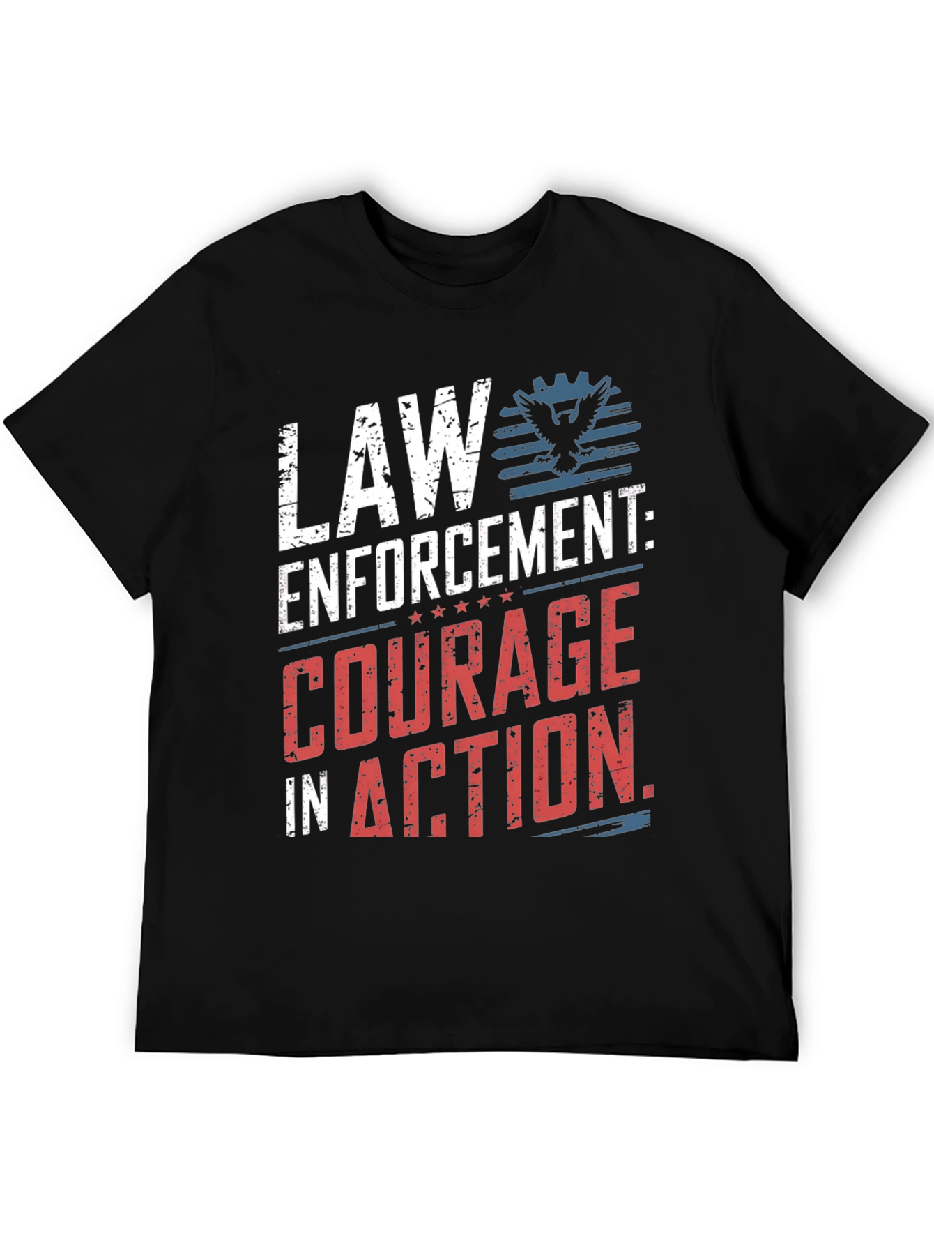 Show your support with this bold graphic t-shirt. The design features a distressed print of "Law Enforcement: Courage in Action," complete with stars and a striking eagle emblem against blue stripes. This classic black tee is perfect for casual wear, demonstrating your patriotism and respect for law enforcement. Made from comfortable materials, it's ideal for everyday wear, rallies, or as a thoughtful gift.