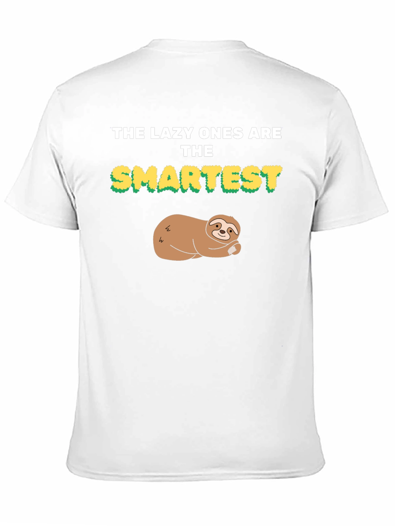 Show off your smart and laid-back personality with this unique graphic tee. The shirt features the phrase 'THE LAZY ONES ARE THE SMARTEST', emphasized with a cute sloth cartoon. Made from comfortable, breathable fabric, this tee is perfect for casual wear, lounging at home, or making a statement wherever you go. The design is eye-catching and adds a touch of humor to your outfit. Pair it with jeans, shorts, or joggers for a relaxed and stylish look. This tee is a great conversation starter and a fun way to express your smart and relaxed attitude. A must-have addition to your wardrobe!