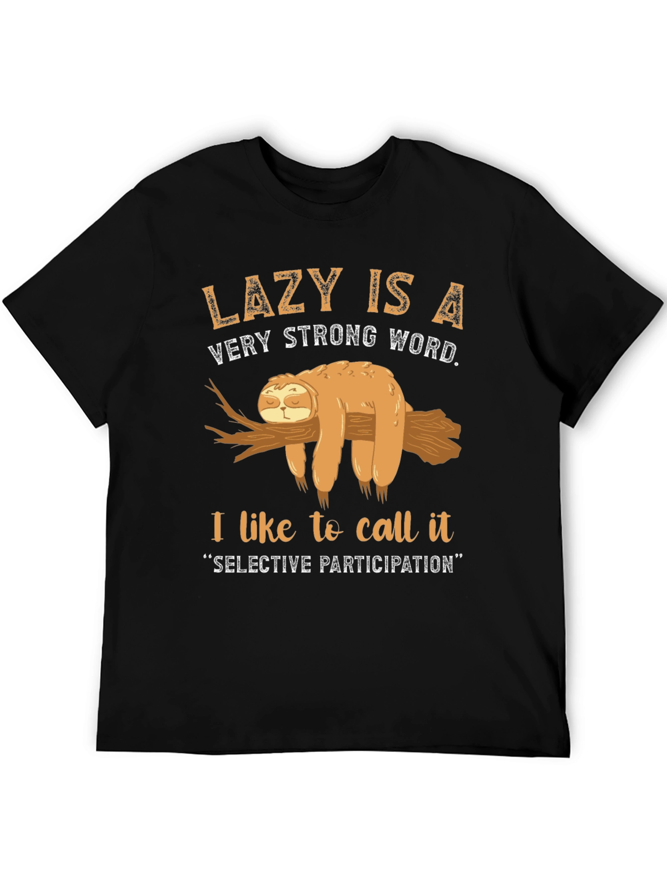This black t-shirt features a humorous graphic of a sloth lounging on a branch, accompanied by the text "LAZY IS A VERY STRONG WORD. I like to call it 'SELECTIVE PARTICIPATION'". This tee is perfect for those who appreciate a laid-back style and a witty sense of humor. The playful design is printed on what appears to be a soft, comfortable fabric, making it ideal for casual wear. This t-shirt is sure to spark conversations and bring smiles wherever you go. Wear it while relaxing at home, hanging out with friends, or running errands – its versatile style makes it suitable for various occasions.