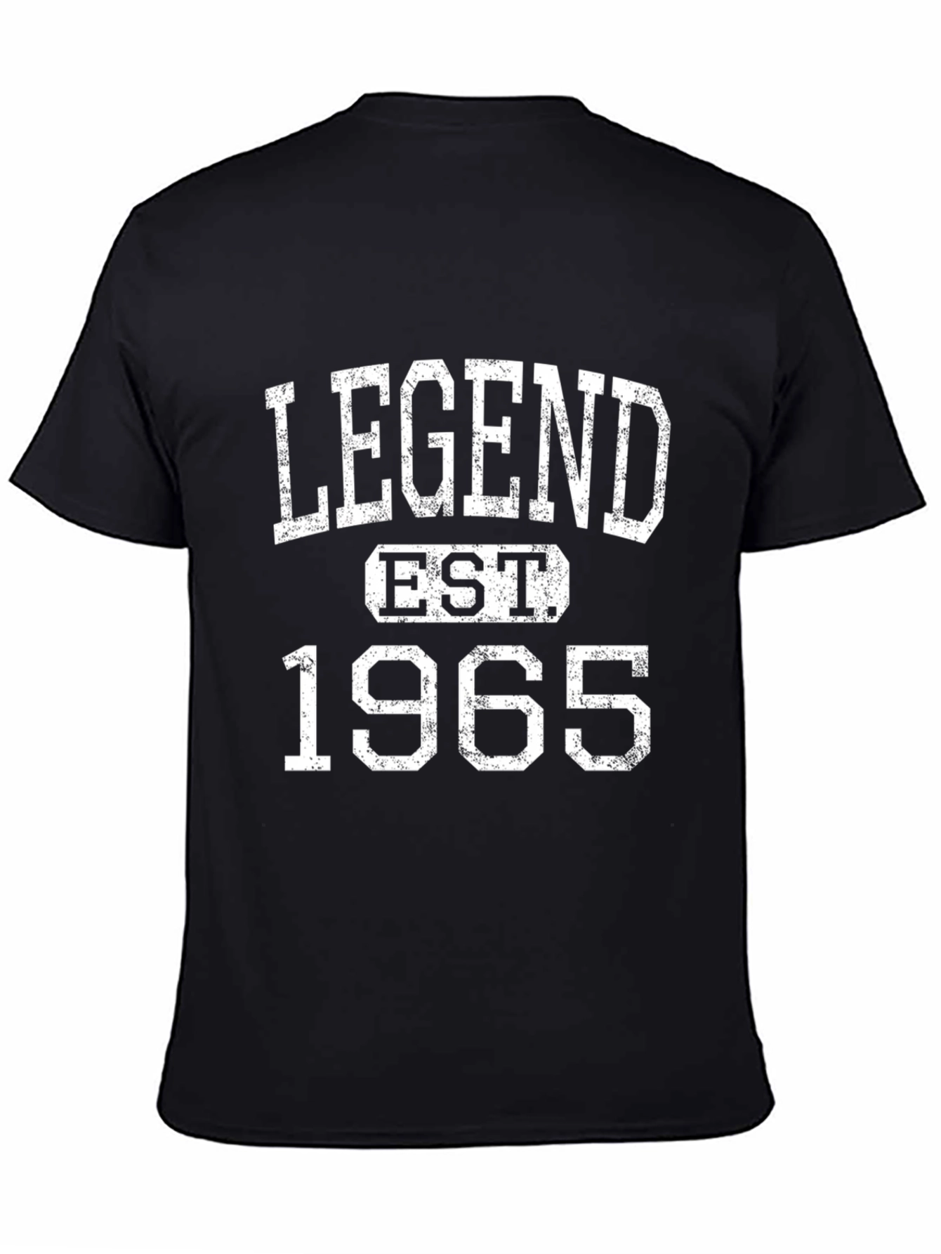 Showcase your legendary status with this classic black graphic tee. Featuring the bold text "LEGEND EST 1965" in a distressed white font, this t-shirt offers a vintage, worn-in look. The design is eye-catching and perfect for casual wear. Made from a soft-looking fabric, this shirt provides both comfort and style. Ideal for those born in or with an affinity for 1965, this tee makes a great birthday gift or conversation starter. Pair it with jeans or shorts for a relaxed yet cool look. Stand out from the crowd and let everyone know you are a legend!