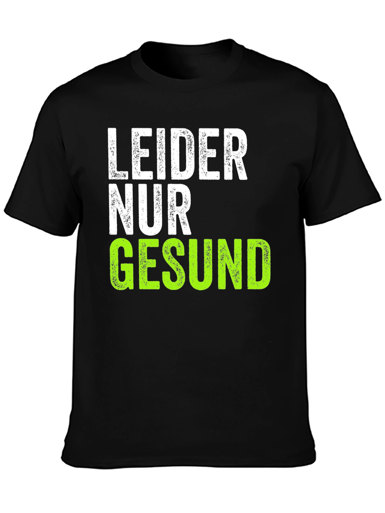 This t-shirt features the German phrase "Leider Nur Gesund" printed in a bold, distressed font. The words "Leider" and "Nur" are in white, while "Gesund" is in a vibrant lime green. The shirt itself appears to be made of soft, black cotton. This tee is perfect for those who value health and humor. Wear it to the gym, casual outings, or even as a conversation starter. The unique design and comfortable fit make it a standout piece in any wardrobe. Show off your playful side and your commitment to well-being with this eye-catching t-shirt. It makes a great gift for your healthy friends and family too!