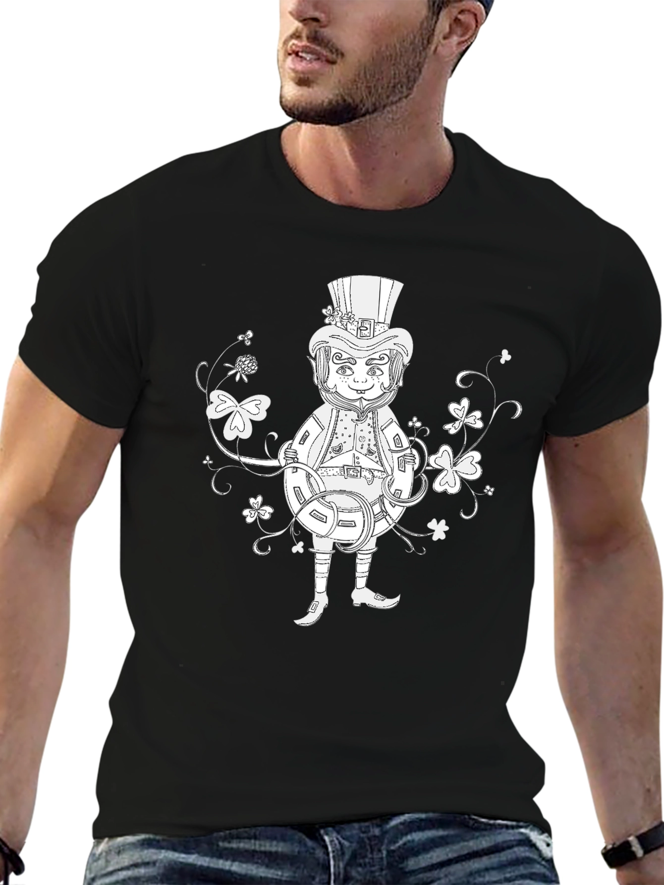 Celebrate St. Patrick's Day in style with this eye-catching black t-shirt! The shirt features a unique graphic of a leprechaun surrounded by shamrocks. The black background makes the white graphic pop, ensuring you'll stand out at any St. Paddy's celebration. Made from a comfortable, breathable fabric, this t-shirt is perfect for all-day wear, whether you're hitting the parade or enjoying a festive gathering with friends. Show off your Irish spirit with this fun and fashionable tee!