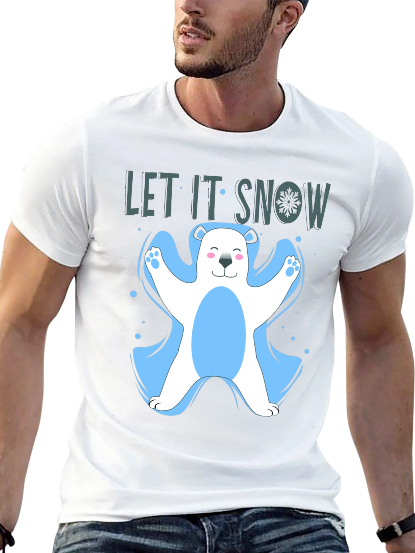 Embrace the winter spirit with this charming black t-shirt featuring a playful polar bear making a snow angel. The design includes the words "Let It Snow" with a snowflake graphic, adding a festive touch. Made from a comfortable, breathable fabric, this tee is perfect for casual wear during the holiday season or any day you want to add a bit of whimsy to your outfit. The shirt's design makes it a great conversation starter and a fun addition to your wardrobe. Enjoy the comfort and style of this unique graphic tee, whether you're staying cozy indoors or out enjoying the winter wonderland.