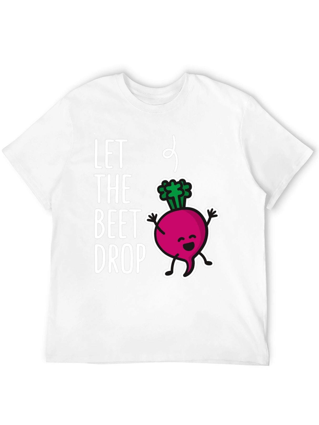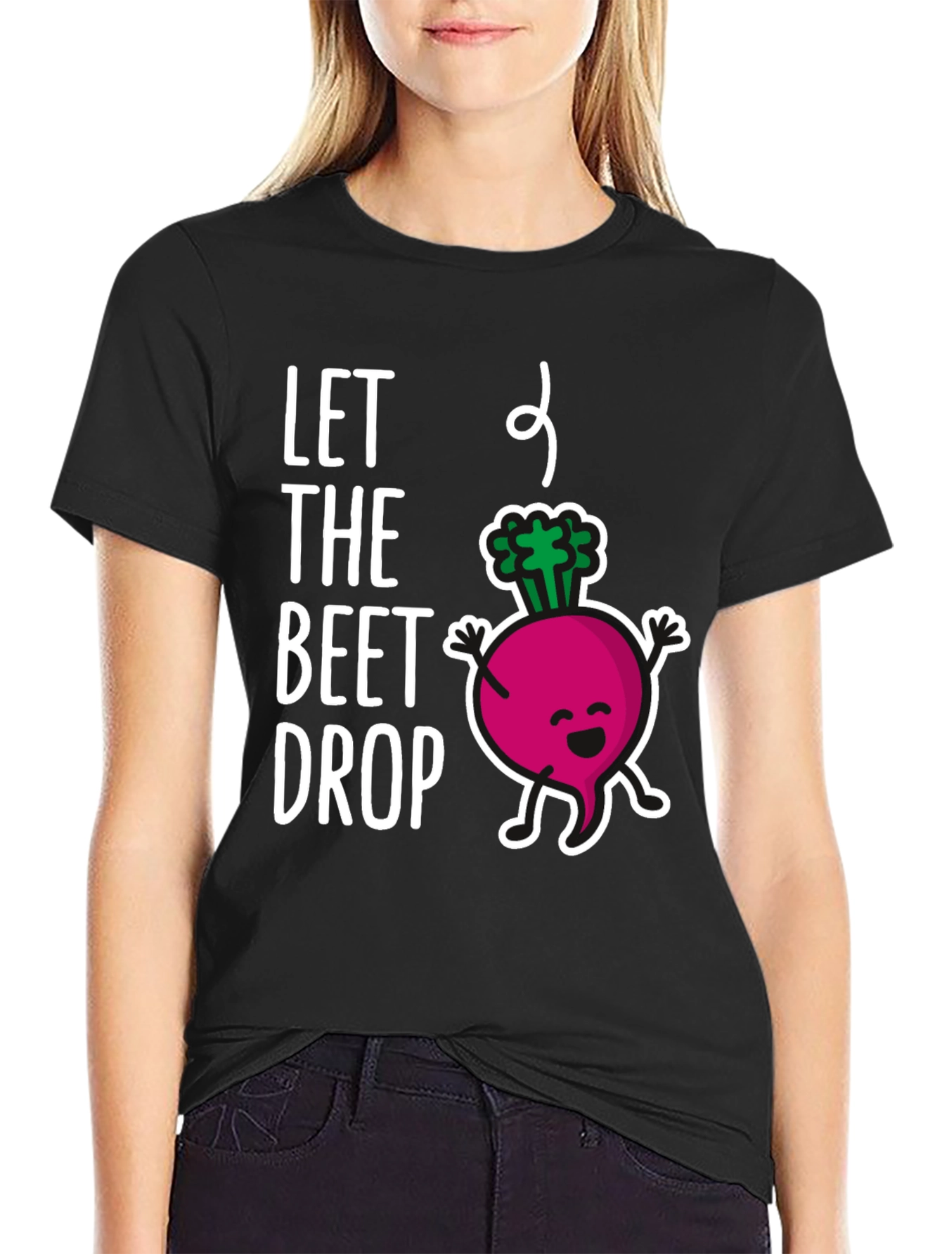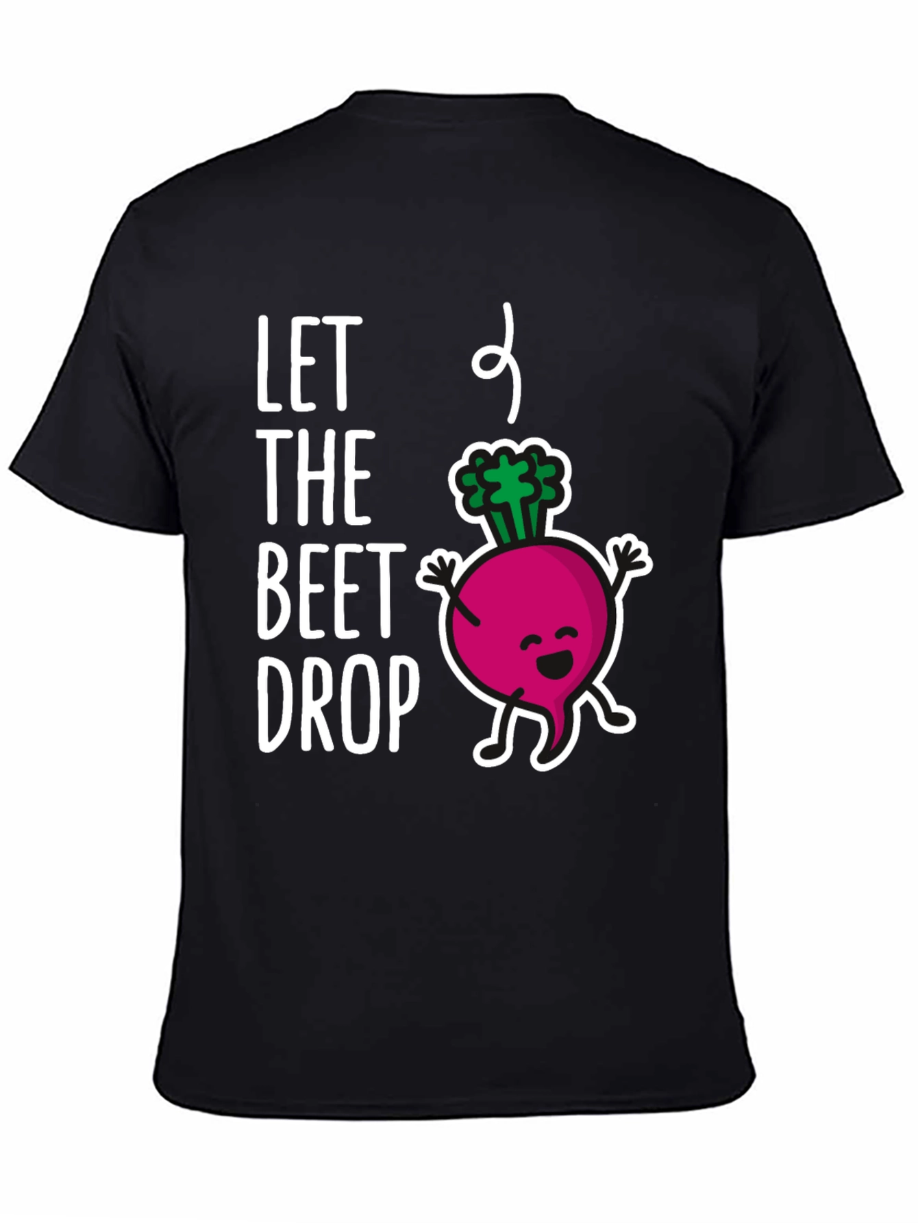 Show off your love for music and veggies with this humorous "Let the Beet Drop" t-shirt. This black tee features a playful cartoon beet graphic with a cheerful expression and dancing pose, complemented by the witty text. Perfect for music lovers, vegetarians, or anyone with a sense of humor, this shirt is sure to be a conversation starter. Its classic fit makes it ideal for casual outings, concerts, or just lounging around. Made from comfortable fabric, this tee offers both style and comfort. Add a touch of fun to your wardrobe with this unique and eye-catching design!