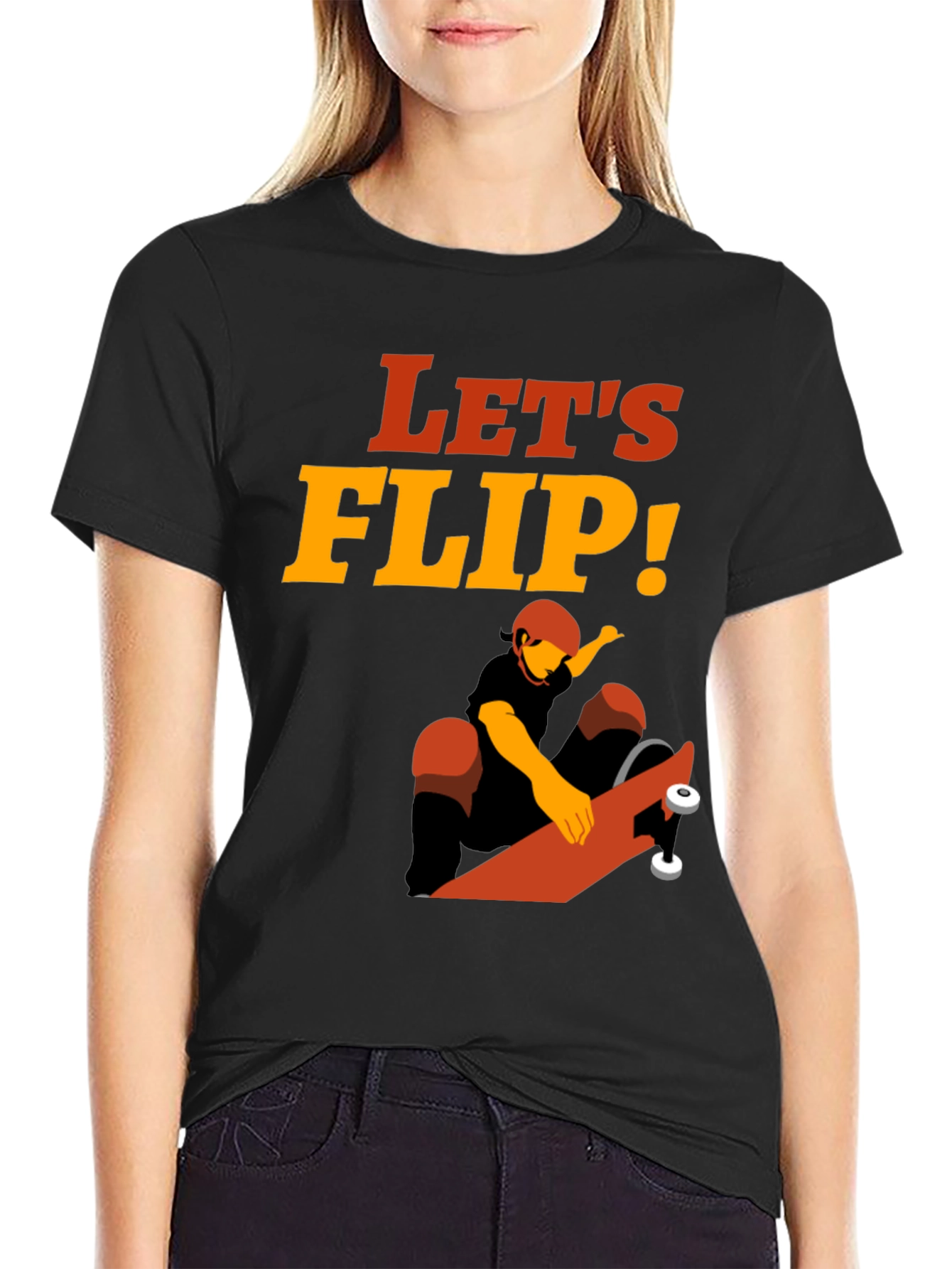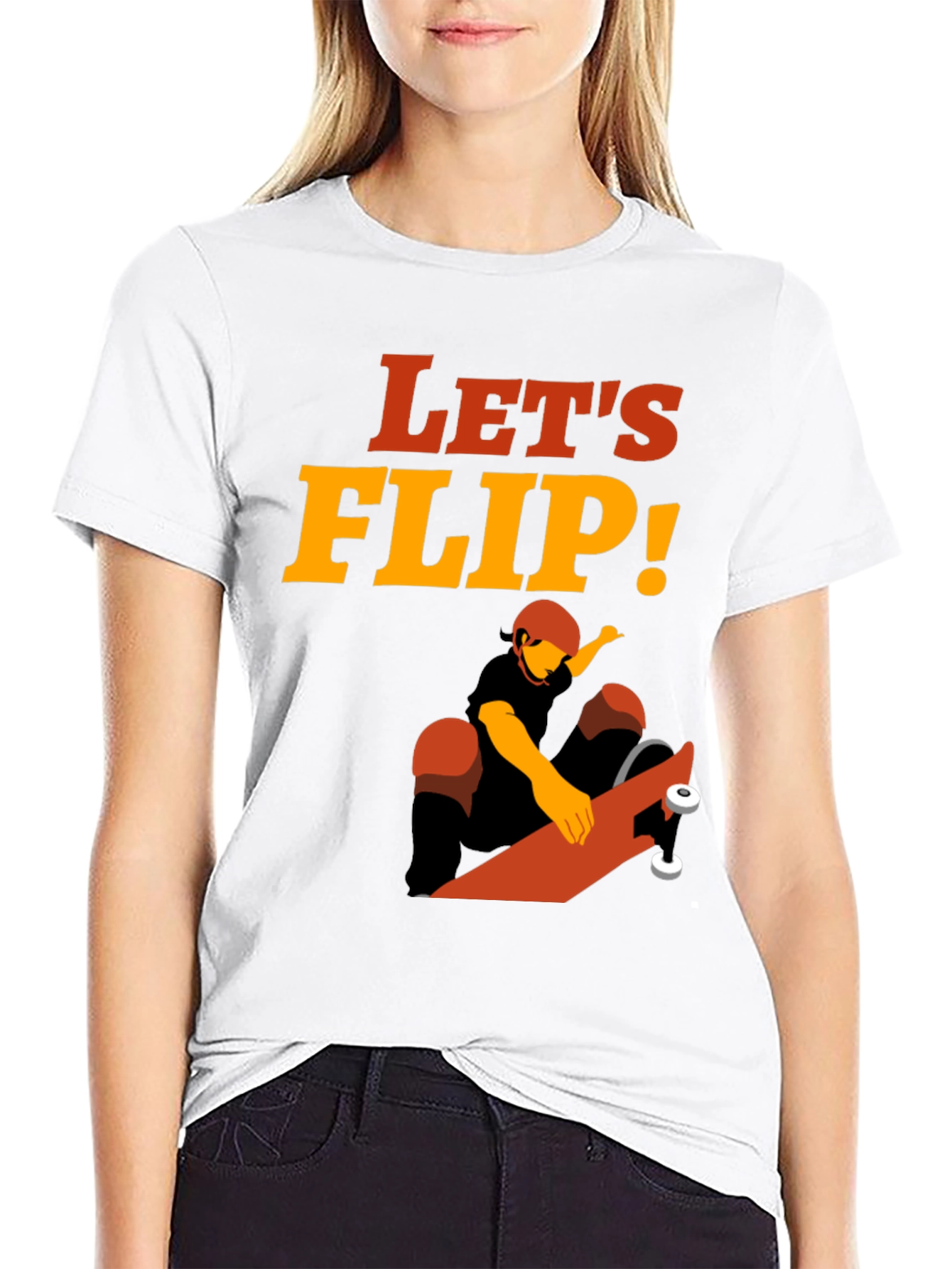 Show off your love for skateboarding with this eye-catching graphic t-shirt! Featuring a bold "Let's Flip!" slogan and a dynamic illustration of a skateboarder in action, this tee is perfect for hitting the skate park or just hanging out. The vibrant colors and unique design will make you stand out from the crowd. Made from a comfortable, breathable fabric, this t-shirt is ideal for everyday wear. Whether you're a seasoned skater or just appreciate the sport, this tee is a must-have addition to your wardrobe. Grab yours now and get ready to shred!