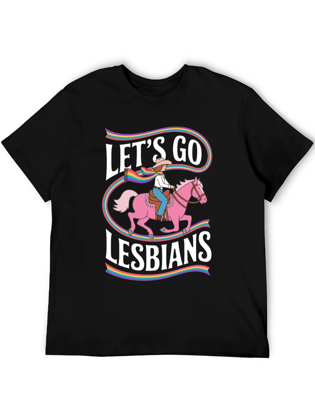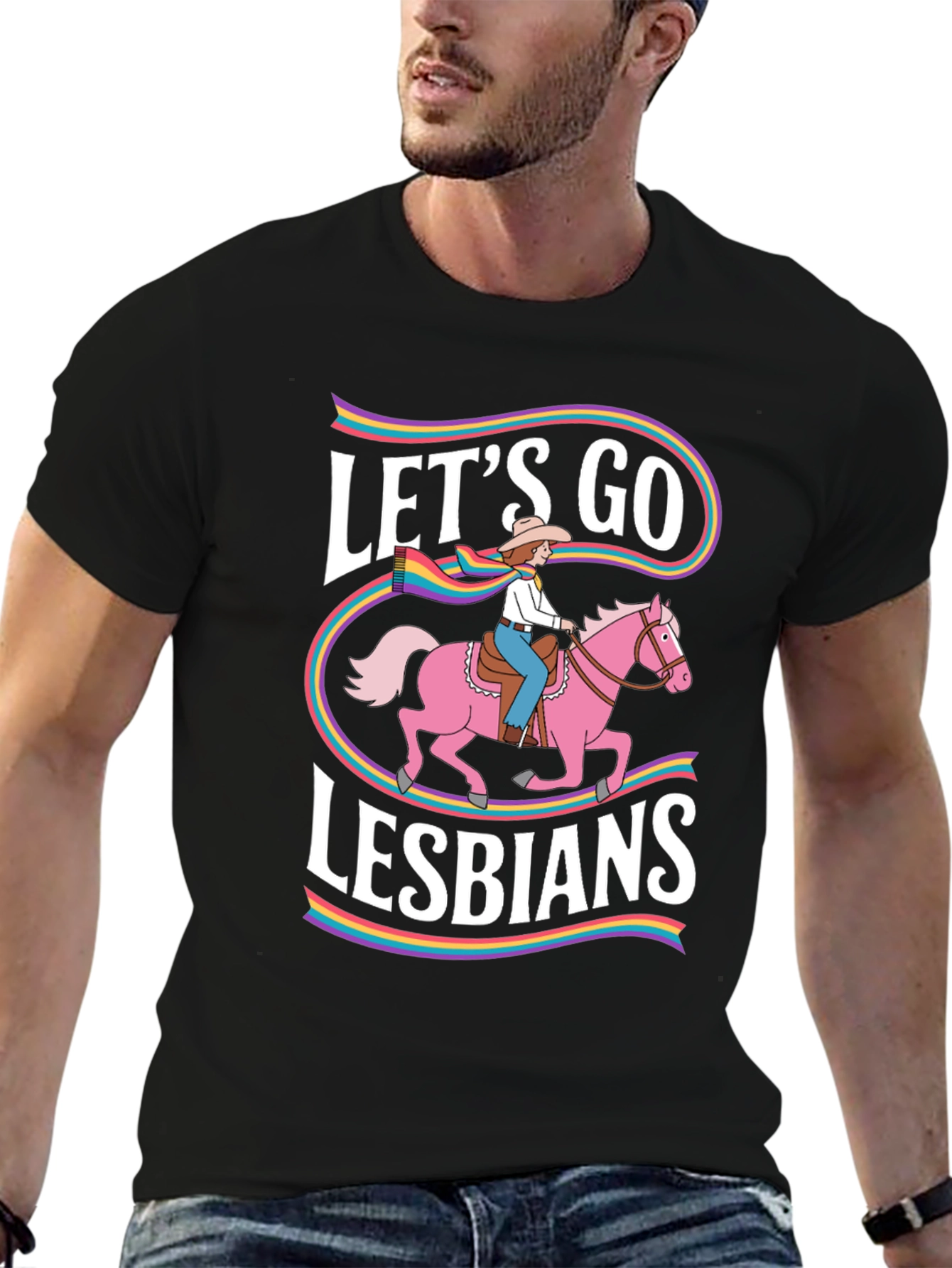 Show your pride with this fun and expressive t-shirt! The design features bold, eye-catching lettering of "LET'S GO LESBIANS" surrounded by a vibrant rainbow graphic. A cartoon image of a cowboy riding a pink horse adds a playful touch. Made from a soft, breathable fabric, this tee offers comfort and style. Perfect for Pride events, casual outings, or making a statement. A great way to express yourself and celebrate love!