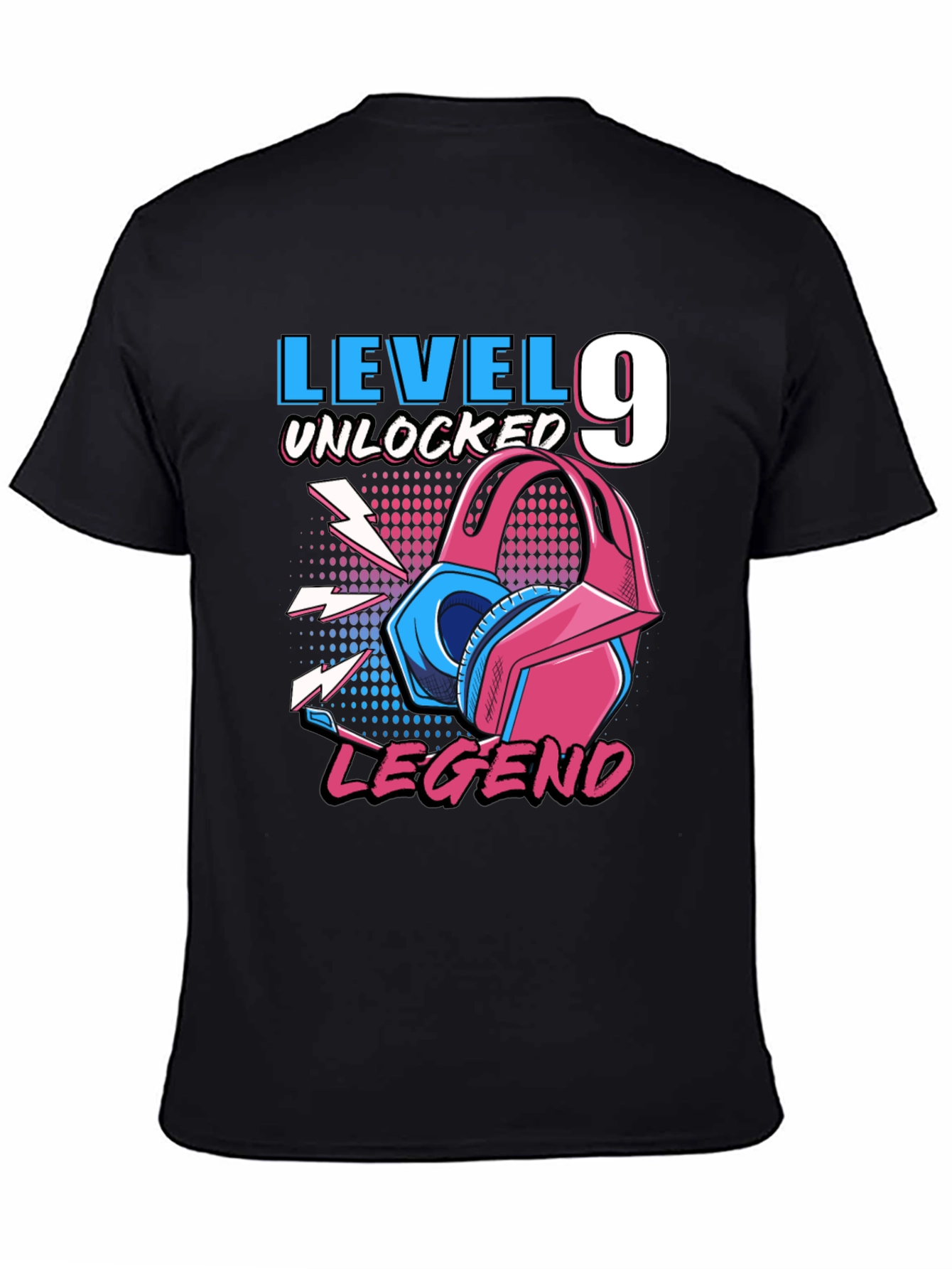 Show off your gaming prowess with this awesome "Level 9 Unlocked Legend" T-shirt! This eye-catching tee features a vibrant graphic design with a gaming headset and lightning bolt accents against a halftone background. The text "Level 9 Unlocked" and "Legend" are displayed prominently in a cool, stylized font. Made from a soft and comfortable material, this black T-shirt is perfect for casual wear, gaming sessions, or as a gift for the gamer in your life. Level up your wardrobe and let everyone know you've achieved legendary status!