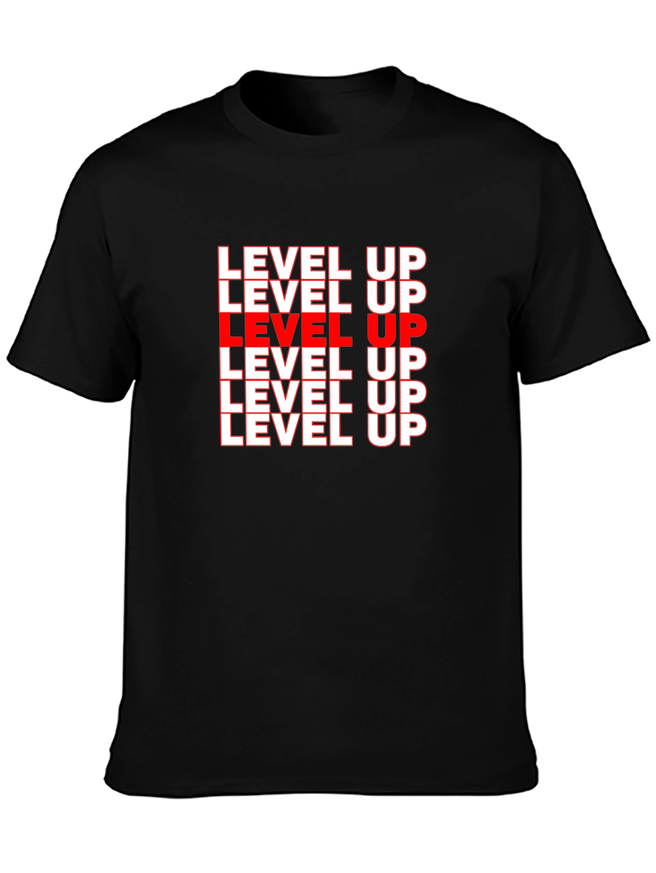 Elevate your style with this bold, black "Level Up" graphic t-shirt. The shirt features a repeating "Level Up" design in white with a striking red accent in the middle, making a statement. Made from a comfortable-looking fabric, this tee is perfect for casual wear, gaming sessions, or hitting the gym. The simple yet eye-catching design makes it easy to pair with jeans, shorts, or joggers. Show off your passion for gaming and progress with this unique and trendy t-shirt.