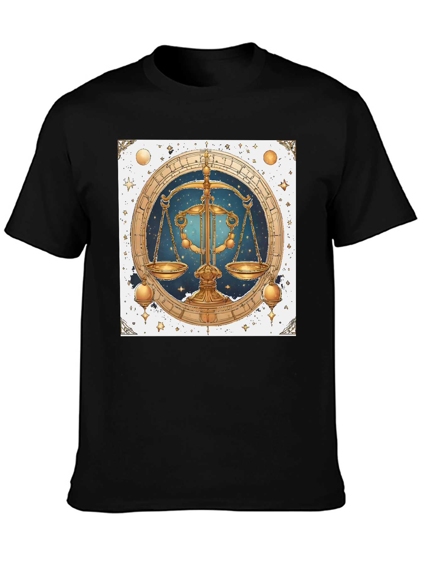 Show off your astrological sign with this stylish black t-shirt featuring a detailed Libra zodiac graphic. The design showcases a golden balance scale surrounded by celestial elements, including stars and planets, set against a deep blue cosmic background. The intricate artwork adds a touch of mystique and elegance to this casual wardrobe staple. Made from comfortable, breathable fabric, this tee is perfect for everyday wear. Whether you're heading to a casual outing, meeting friends, or simply relaxing at home, this Libra t-shirt lets you express your personality with a fashionable flair. A unique and eye-catching addition to any wardrobe!