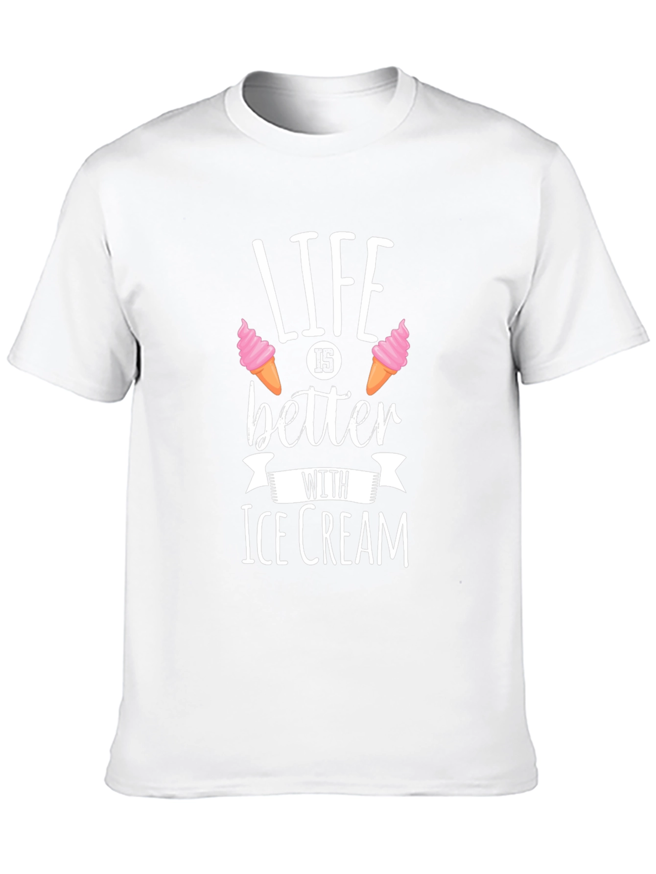 Indulge in sweet style with this fun black T-shirt. The design features the phrase "Life is better with Ice Cream" in a playful white font, complete with charming ice cream cone graphics. Made from a soft, breathable fabric, this tee offers all-day comfort and a relaxed fit. The design is perfect for ice cream lovers and adds a whimsical touch to any casual outfit. Wear it on your next trip to the ice cream parlor, a summer outing, or simply as a fun everyday statement piece. This T-shirt is sure to bring a smile to your face and those around you!