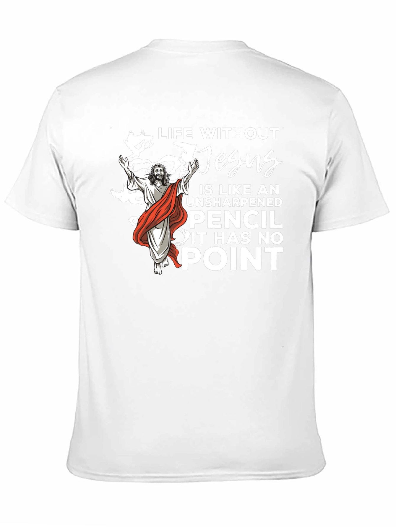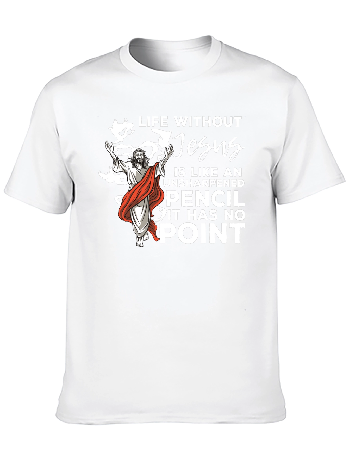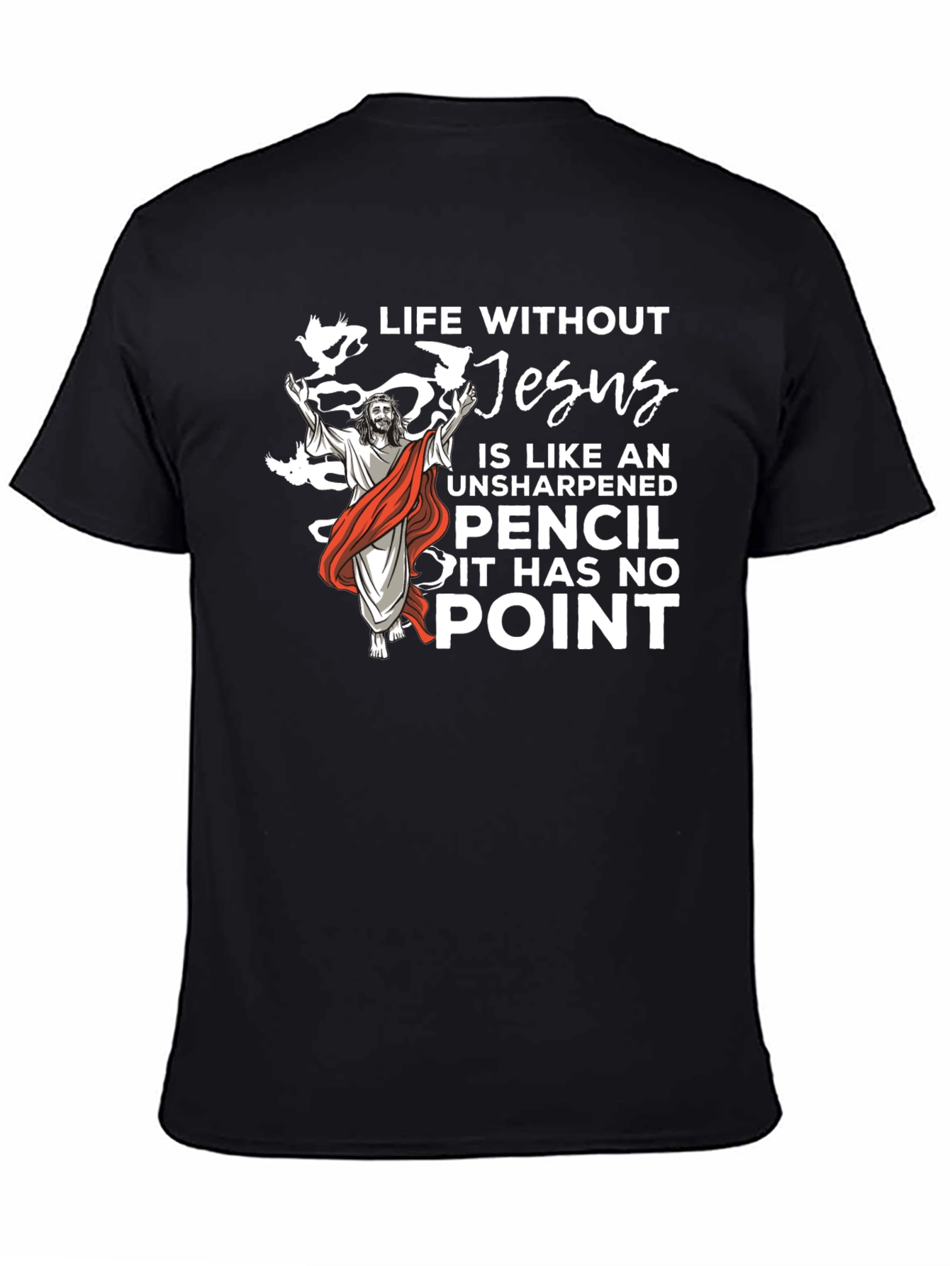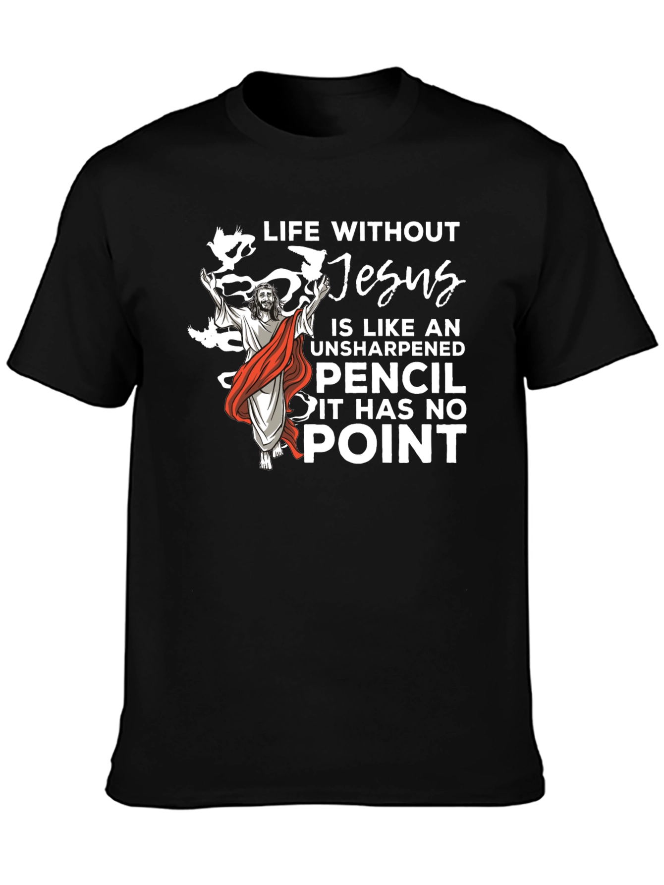 Embrace faith with this black graphic t-shirt. It features a bold design with an image of Jesus and the text: "Life Without Jesus Is Like an Unsharpened Pencil, It Has No Point". This shirt is made from comfortable material. Perfect for expressing your beliefs in style, it can be worn casually or at religious events. A meaningful addition to your wardrobe.