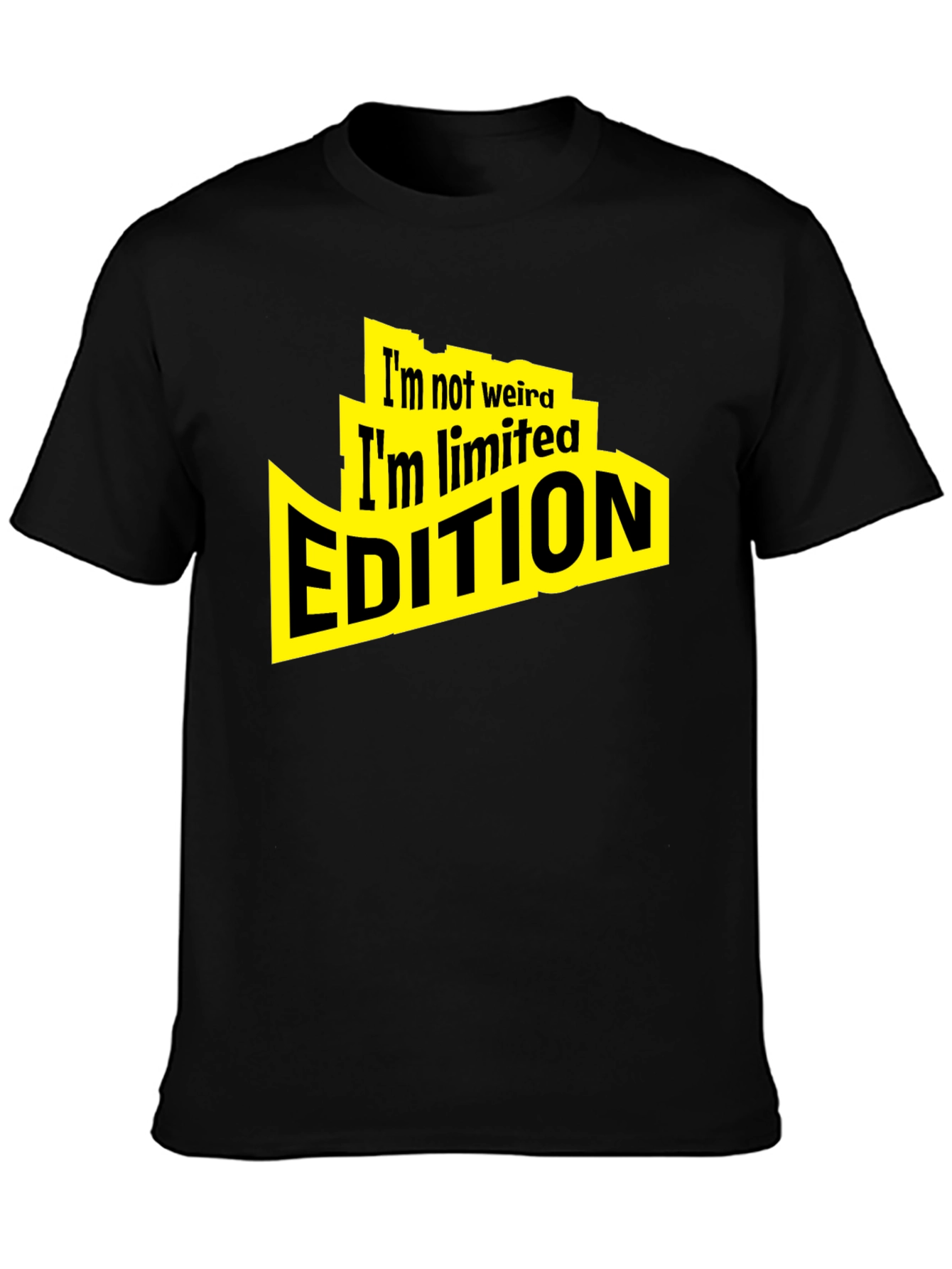 This stylish black t-shirt features a bold yellow graphic that declares, "I'm not weird, I'm limited EDITION." The humorous slogan is eye-catching and makes a statement. Made from a soft, comfortable fabric, this tee is perfect for casual wear, expressing individuality, or sparking conversation. The classic fit ensures a relaxed and flattering look for all. Wear it to parties, social gatherings, or everyday outings to showcase your unique sense of humor and limited-edition status. Get ready to turn heads and embrace your quirky side with this standout tee!