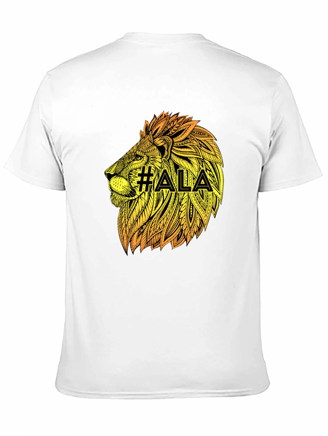 Roar into style with this unique black t-shirt featuring a striking lion design. The eye-catching graphic boasts intricate details in gold tones, accented with '#ALA', adding a touch of modern flair. Made from a comfortable fabric, this tee is perfect for casual wear, making a bold statement wherever you go. The classic cut ensures a relaxed fit, ideal for pairing with jeans or shorts. Show off your wild side with this must-have addition to your wardrobe.