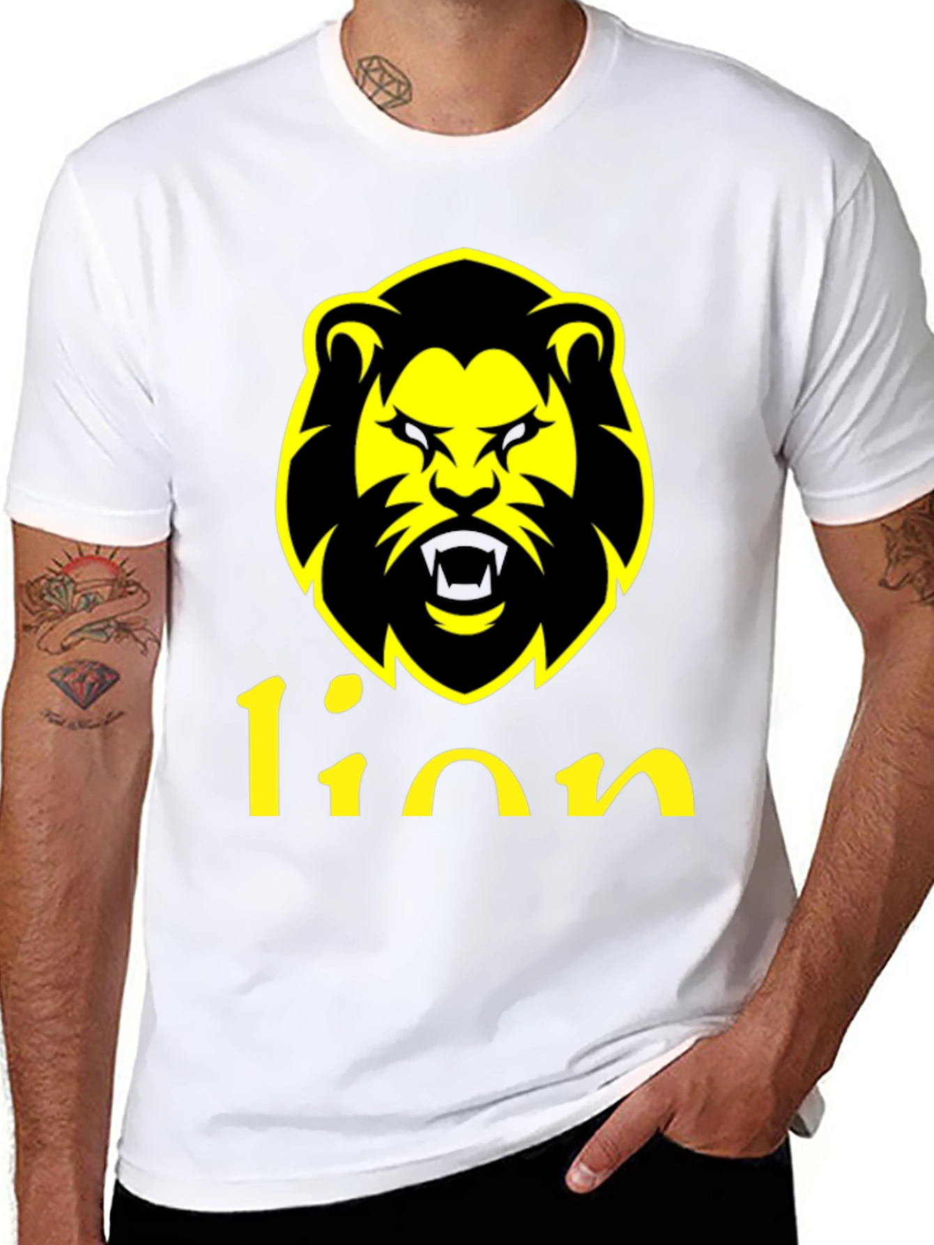 Roar with style in this bold black t-shirt featuring a striking yellow lion graphic. The eye-catching design showcases a fierce lion head above the word 'lion' in a matching yellow font. Made from a comfortable-looking fabric, this tee is perfect for casual wear, making a statement wherever you go. Whether you're hitting the streets or lounging at home, this lion graphic tee is an ideal choice for those who want to unleash their inner king. Stand out from the crowd and express your unique personality with this trendy and comfortable t-shirt.