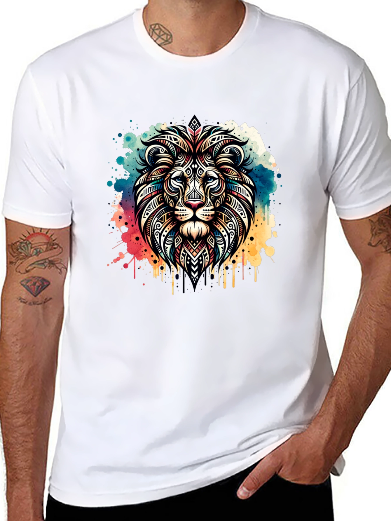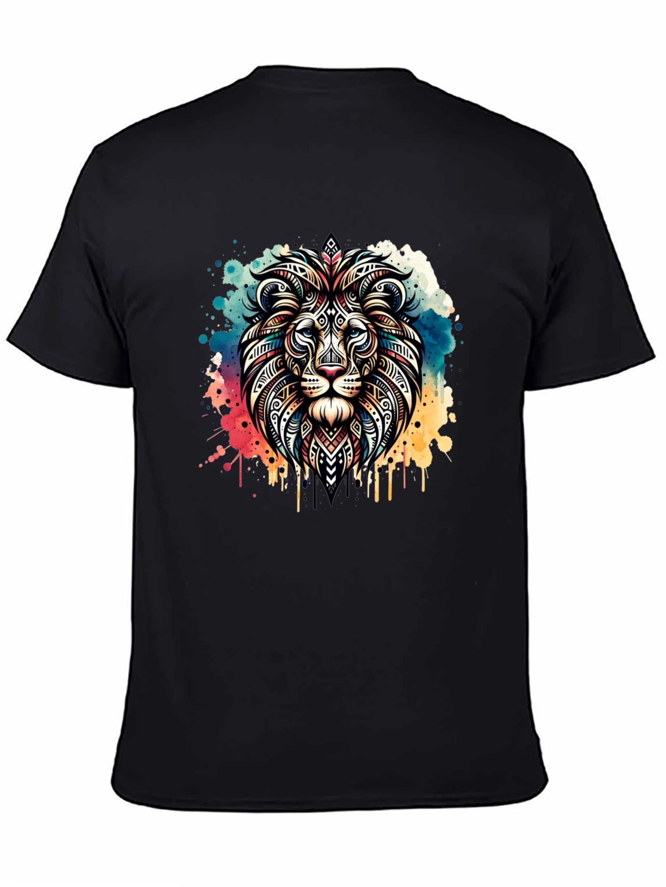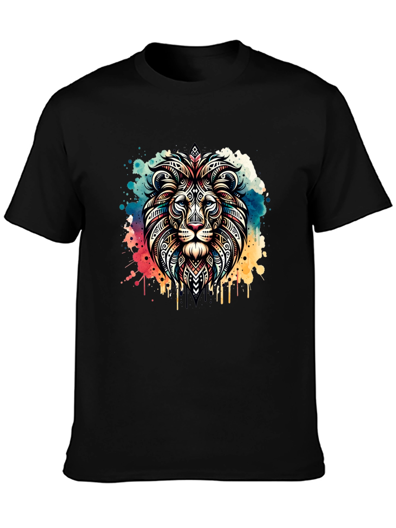 Make a bold statement with this men's black t-shirt featuring a striking lion head graphic. The design showcases an intricately detailed lion with tribal-inspired patterns and vibrant watercolor splatters in the background, creating a visually stunning and unique look. Crafted from a soft and comfortable fabric, this tee offers a great fit and feel. Perfect for casual wear, concerts, or expressing your individual style, this eye-catching t-shirt is sure to turn heads. Add a touch of wild elegance to your wardrobe with this must-have graphic tee.