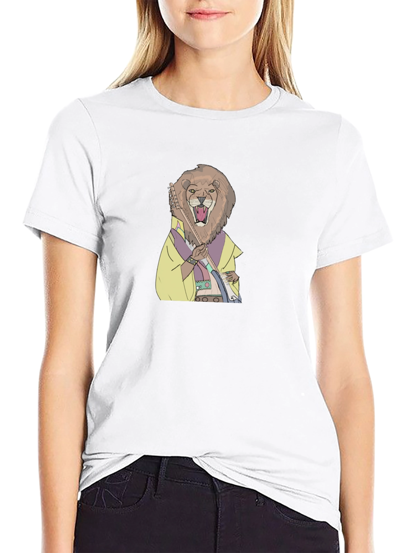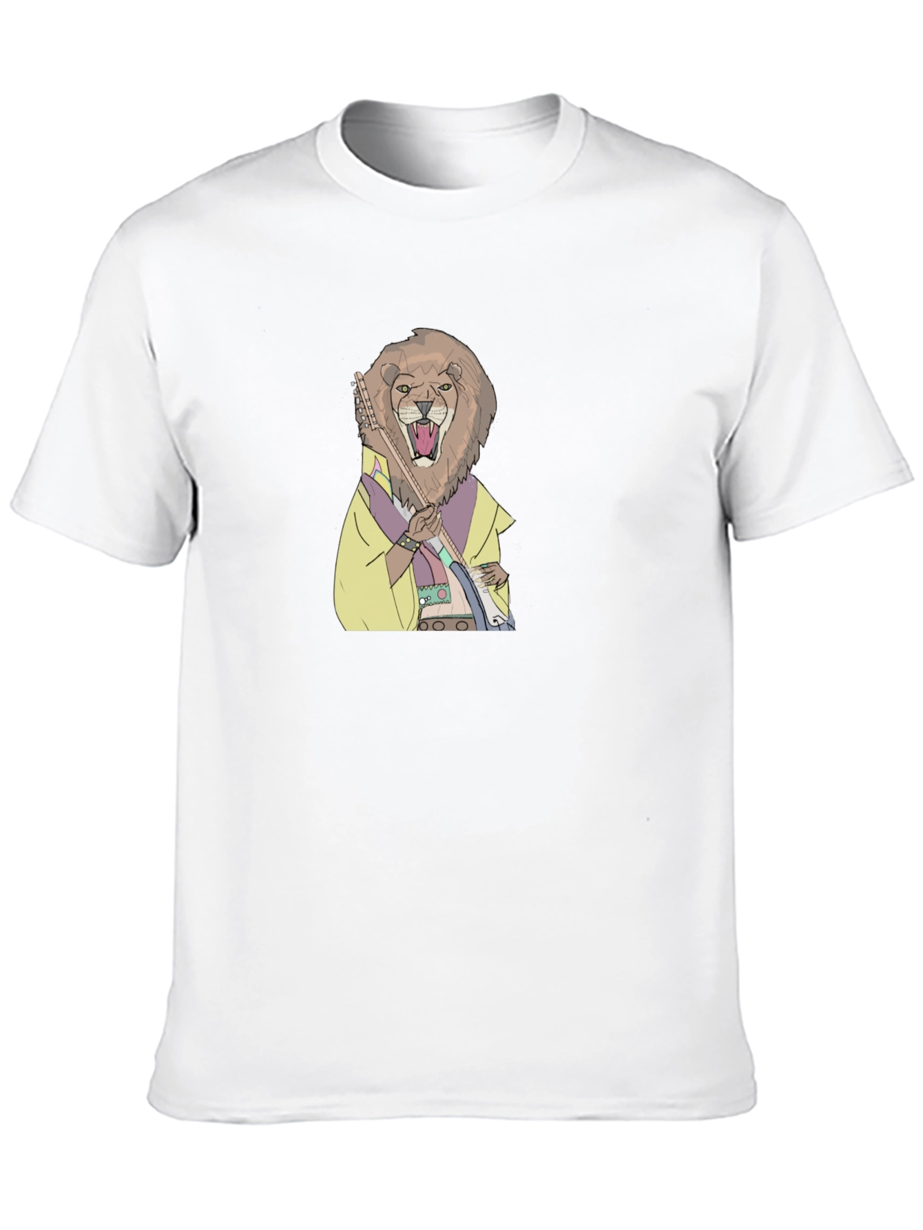 Rock out with this unique black t-shirt featuring a bold graphic print! This eye-catching design showcases a cartoon lion musician playing the guitar, blending playful style with a touch of rockstar edge. The classic crew neck and short sleeves create a comfortable, everyday fit, perfect for casual wear. Made from soft, breathable fabric, this t-shirt is ideal for expressing your personality and adding a fun twist to your wardrobe. Wear it to concerts, parties, or just hanging out with friends. Make a statement with this cool and quirky tee!