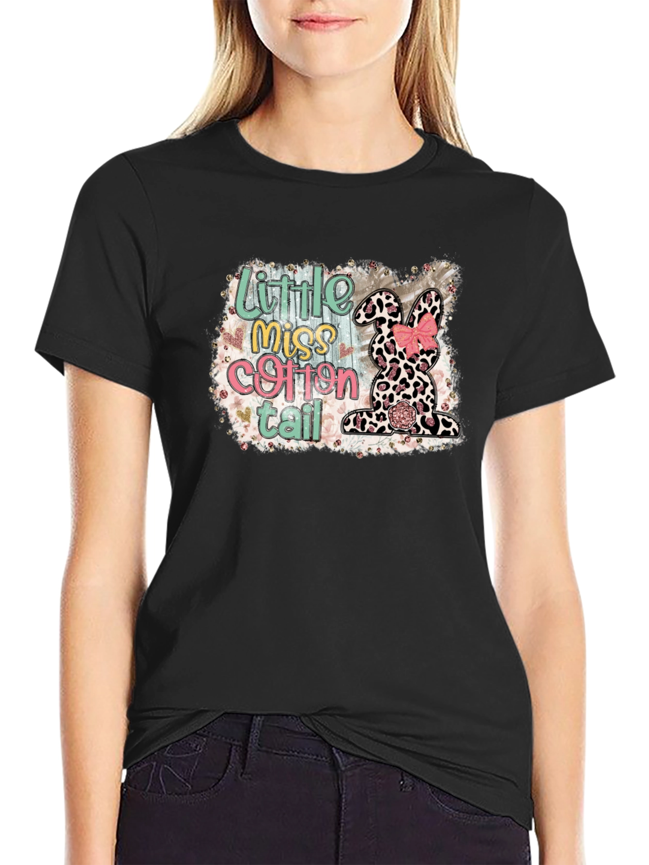 Celebrate Easter in style with this adorable "Little Miss Cottontail" T-shirt. The black tee features a vibrant graphic design with a cute leopard-print bunny accented by a pink bow and floral details. This festive shirt is perfect for Easter egg hunts, family gatherings, or everyday wear to show off your holiday spirit. Comfortable and eye-catching, it's sure to be a hit with kids and adults alike. The playful design and soft fabric make it an ideal addition to your Easter wardrobe. Get yours today and hop into the holiday fun!