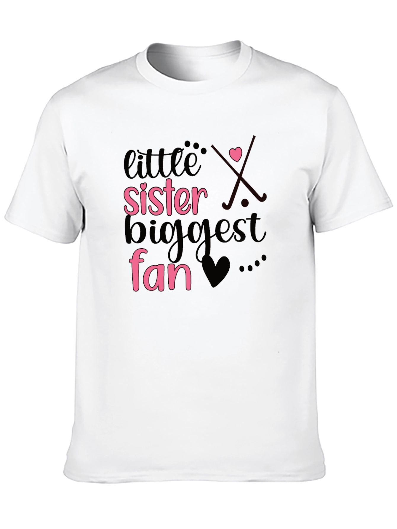 Show your support with this stylish black t-shirt. It features the words "Little Sister Biggest Fan" in a combination of black and pink lettering, adorned with hockey stick accents. The design also includes heart details, perfect for showing love. Made from comfortable, breathable fabric, this t-shirt is ideal for wearing to games, family events, or casual outings. The classic fit ensures a relaxed and flattering look. It's a perfect gift for any proud little sister or supportive family member, sure to turn heads and spark conversations.