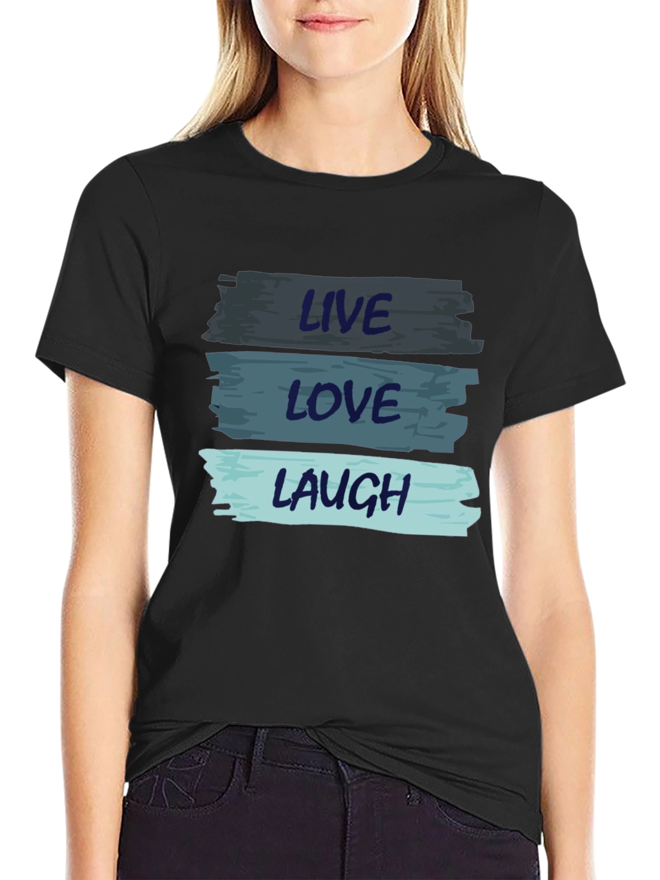 Elevate your casual style with this eye-catching black graphic t-shirt. The design features the uplifting mantra "Live Love Laugh" printed across three distinct brushstroke-style stripes in shades of blue. Made from a soft and comfortable fabric, this tee is perfect for everyday wear. Showcase your positive outlook with this versatile shirt that pairs effortlessly with jeans, shorts, or your favorite casual bottoms. It's an ideal choice for weekend outings, relaxed gatherings, or simply adding a touch of inspiration to your daily attire.