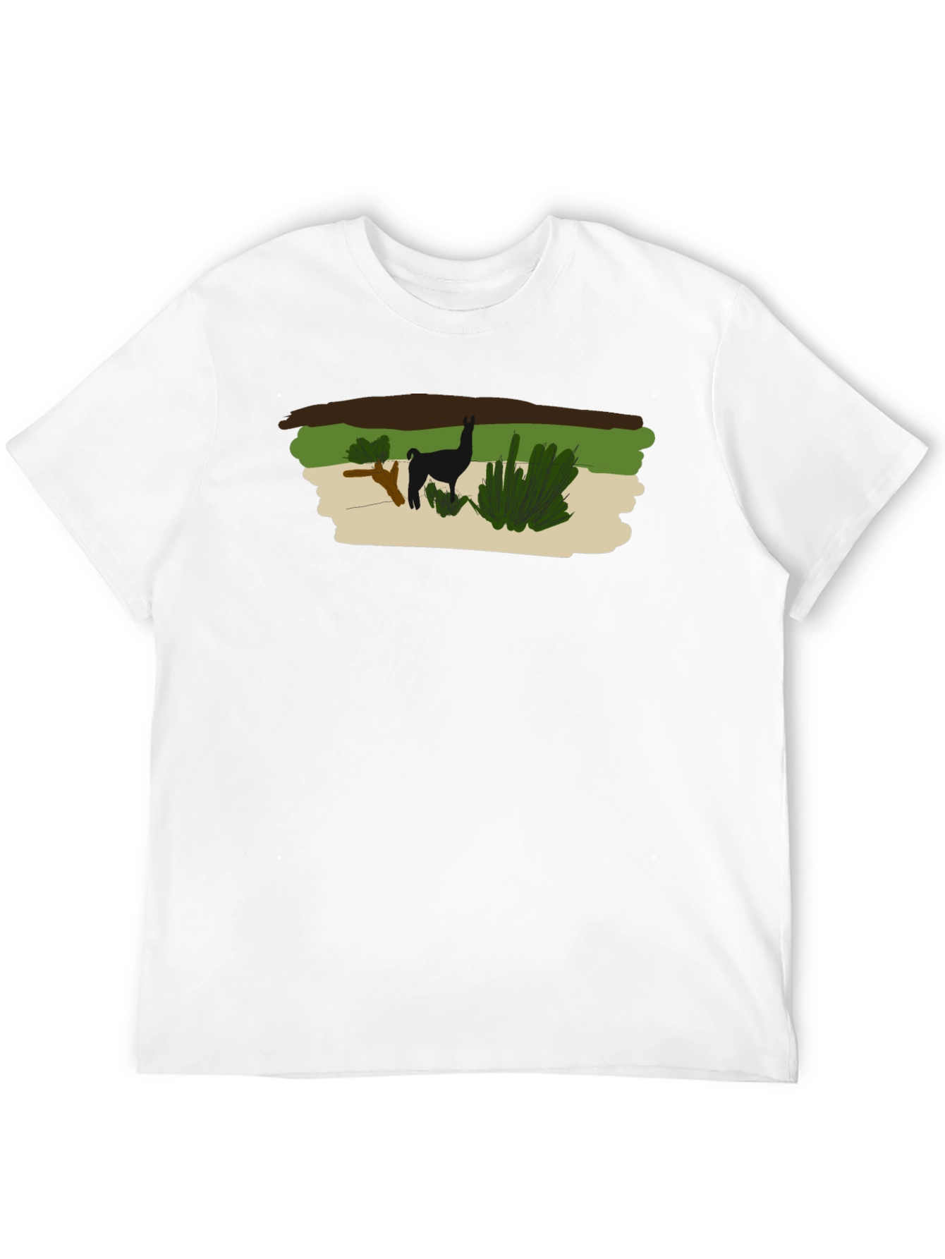 This sleek black t-shirt features a unique graphic print. The design showcases a stylized landscape scene with a llama figure, adding a touch of the outdoors to your casual wear. Made from a comfortable-looking fabric, this tee is perfect for everyday use. The design is distinctive and eye-catching, making it a great conversation starter. Pair this t-shirt with your favorite jeans or shorts for a relaxed yet stylish look. This shirt is ideal for animal lovers or those who appreciate artistic apparel. Step up your wardrobe with this unique graphic tee!