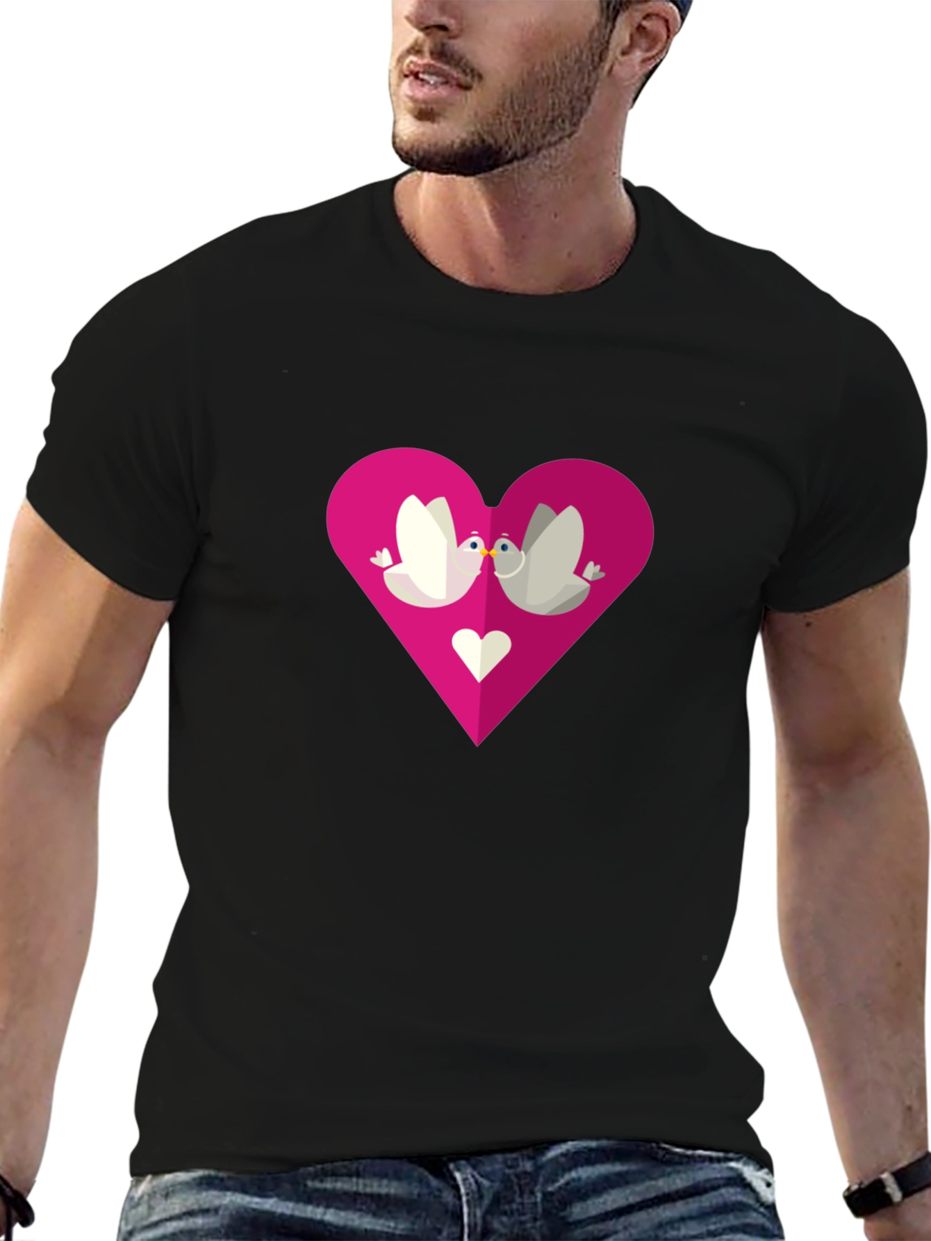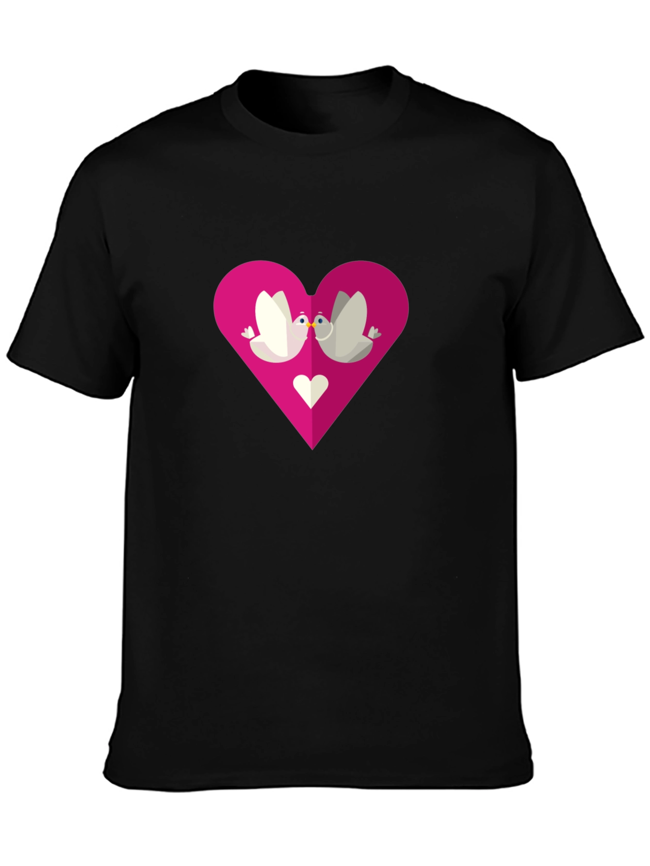 Show your affection with this charming black t-shirt featuring a delightful graphic print. The design showcases a bright pink heart with two facing white birds and a small heart in the middle, creating a cute and romantic image. Made from a comfortable, soft fabric, this tee offers a great fit for everyday wear. This shirt is versatile and perfect for casual outings, date nights, or as a thoughtful gift for someone special. Let your style speak volumes with this eye-catching and lovable design.